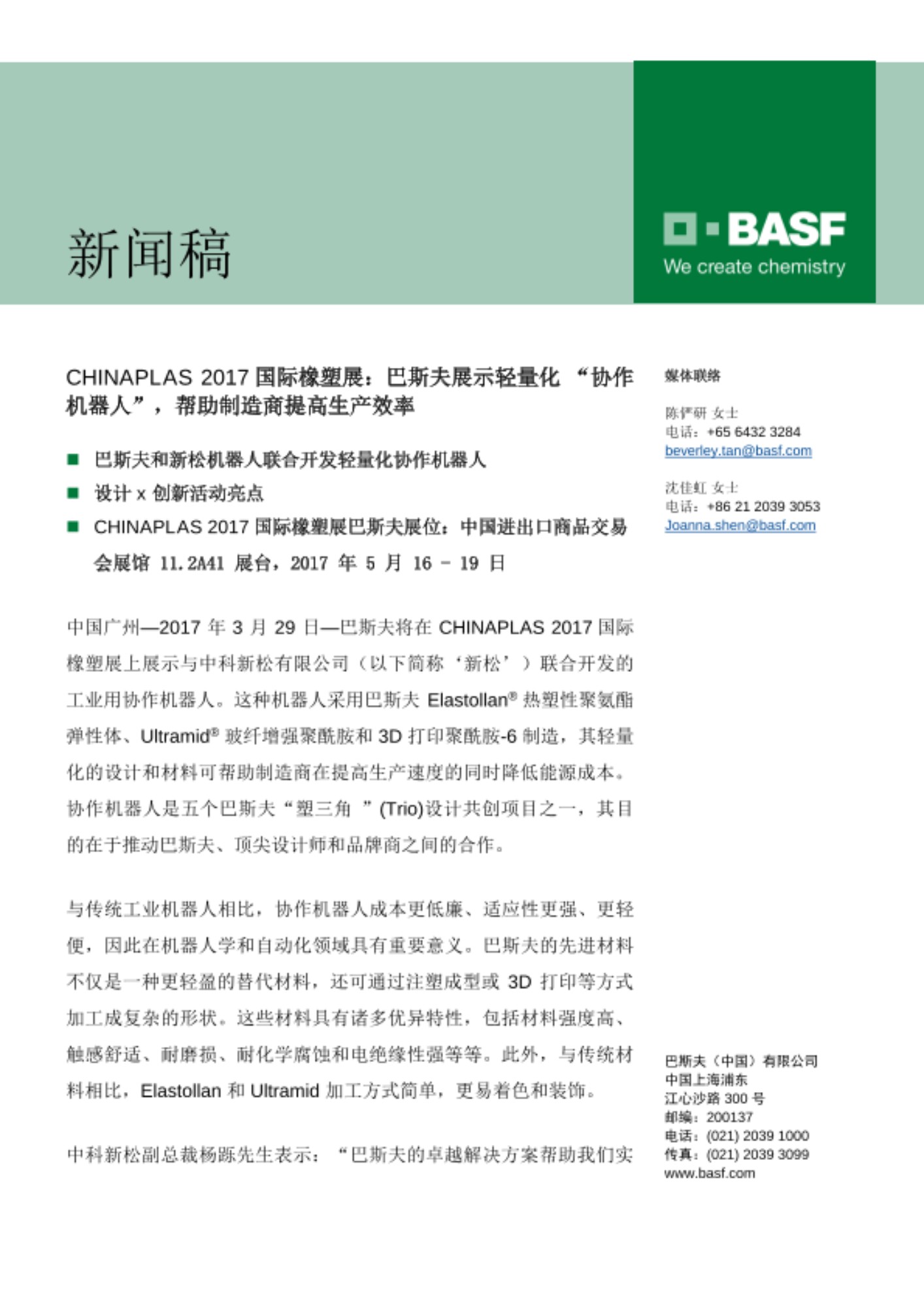 中国广州—2017 年 3 月 29 日—巴斯夫将在 CHINAPLAS 2017国际橡塑展上展示与中科新松有限公司(以下简称‘新松’)联合开发的工业用协作机器人。这种机器人采用巴斯夫 Elastollan® 热塑性聚氨酯弹性体、Ultramid® 玻纤增强聚酰胺和 3D 打印聚酰胺-6 制造,其轻量化的设计和材料可帮助制造商在提高生产速度的同时降低能源成本。协作机器人是五个巴斯夫“塑三角 ”(Trio)设计共创项目之一,其目的在于推动巴斯夫、顶尖设计师和品牌商之间的合作。