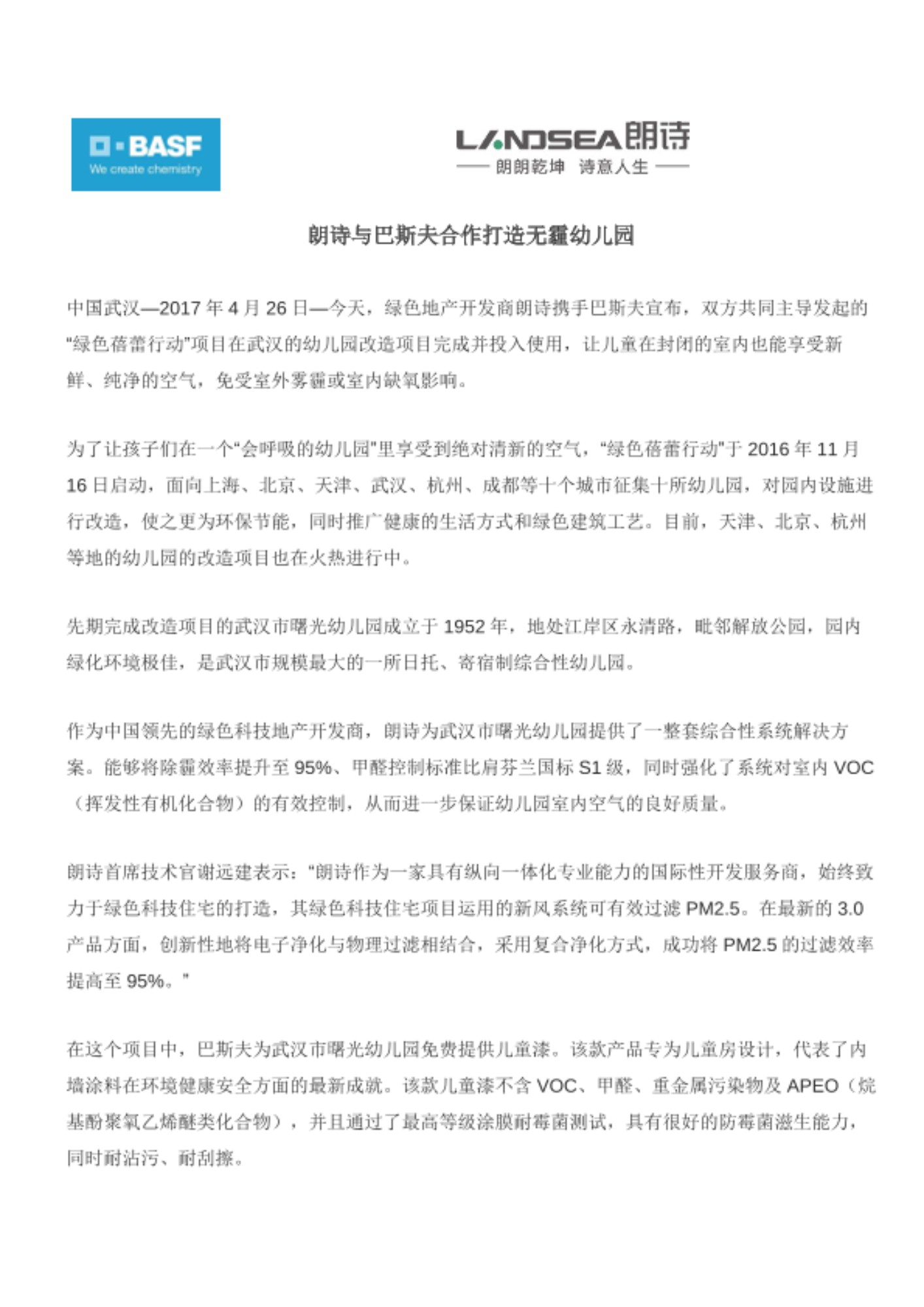 中国武汉—2017年4月26日—今天,绿色地产开发商朗诗携手巴斯夫宣布,双方共同主导发起的“绿色蓓蕾行动”项目在武汉的幼儿园改造项目完成并投入使用,让儿童在封闭的室内也能享受新鲜、纯净的空气,免受室外雾霾或室内缺氧影响。