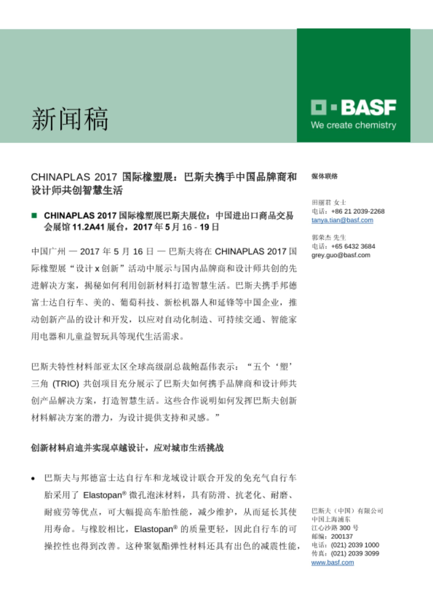 - CHINAPLAS 2017 国际橡塑展巴斯夫展位:中国进出口商品交易会展馆 11.2A41 展台,2017 年 5 月 16 - 19 日