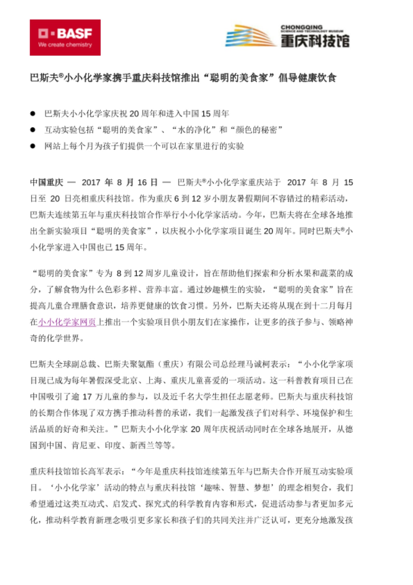 中国重庆 — 2017 年 8 月16日 — 巴斯夫®小小化学家重庆站于 2017 年 8 月 15 日至 20 日亮相重庆科技馆。作为重庆6到12岁小朋友暑假期间不容错过的精彩活动,巴斯夫连续第五年与重庆科技馆合作举行小小化学家活动。今年,巴斯夫将在全球各地推出全新实验项目“聪明的美食家”,以庆祝小小化学家项目诞生20周年。同时巴斯夫®小小化学家进入中国也已15周年。