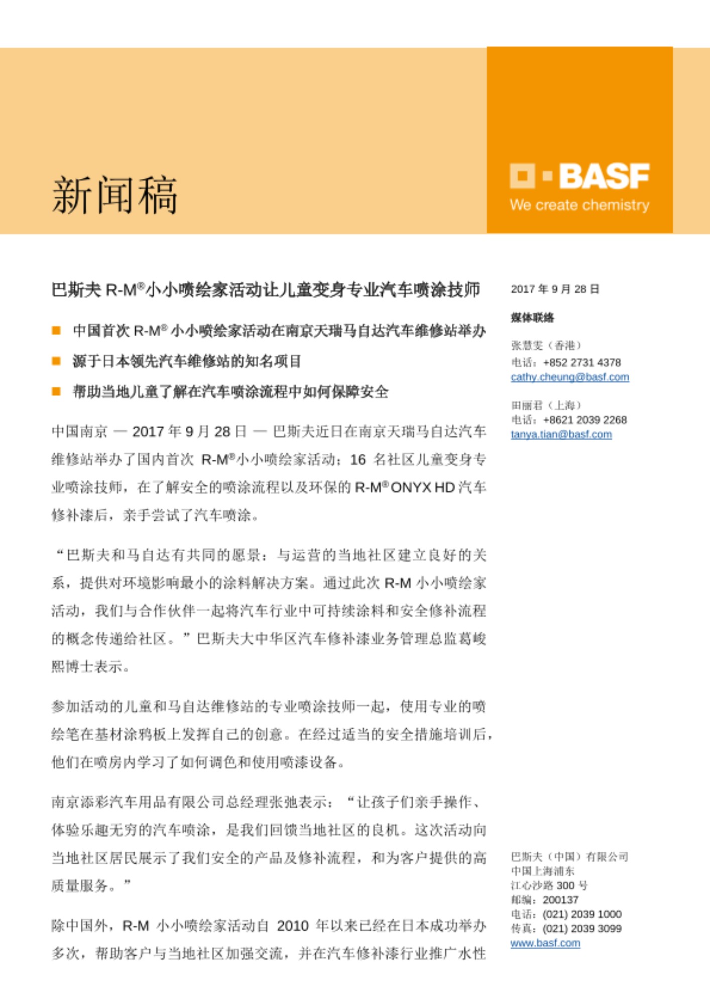 中国南京 — 2017 年 9 月 28 日 — 巴斯夫近日在南京天瑞马自达汽车维修站举办了国内首次R-M®小小喷绘家活动;16名社区儿童变身专业喷涂技师,在了解安全的喷涂流程以及环保的R-M® ONYX HD汽车修补漆后,亲手尝试了汽车喷涂。