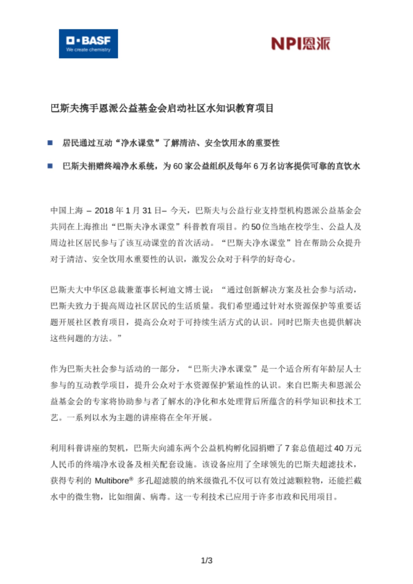 - 巴斯夫捐赠终端净水系统,为60家公益组织及每年6万名访客提供可靠的直饮水