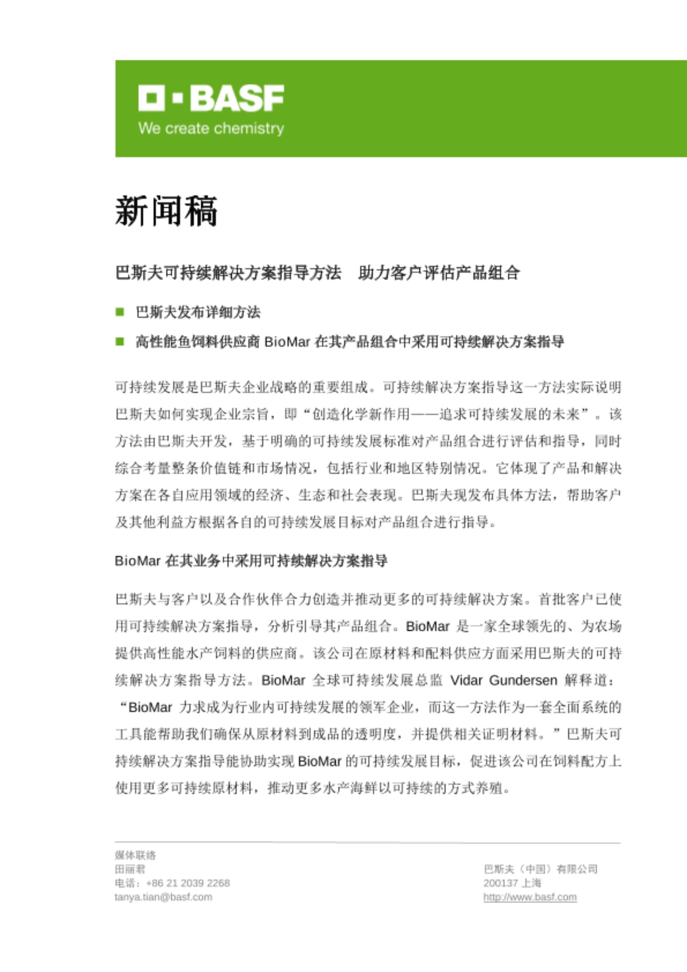 巴斯夫与客户以及合作伙伴合力创造并推动更多的可持续解决方案。首批客户已使用可持续解决方案指导,分析引导其产品组合。BioMar 是一家全球领先的、为农场提供高性能水产饲料的供应商。该公司在原材料和配料供应方面采用巴斯夫的可持续解决方案指导方法。BioMar 全球可持续发展总监 Vidar Gundersen 解释道:“BioMar力求成为行业内可持续发展的领军企业,而这一方法作为一套全面系统的工具能帮助我们确保从原材料到成品的透明度,并提供相关证明材料。”巴斯夫可持续解决方案指导能协助实现 BioMar 的可持续发展目标,促进该公司在饲料配方上使用更多可持续原材料,推动更多水产海鲜以可持续的方式养殖。