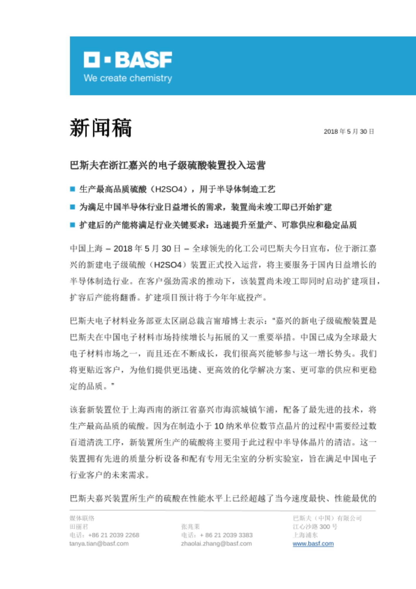 中国上海 – 2018年5月30日 – 全球领先的化工公司巴斯夫今日宣布,位于浙江嘉兴的新建电子级硫酸(H2SO4)装置正式投入运营,将主要服务于国内日益增长的半导体制造行业。在客户强劲需求的推动下,该装置尚未竣工即同时启动扩建项目,扩容后产能将翻番。扩建项目预计将于今年年底投产。