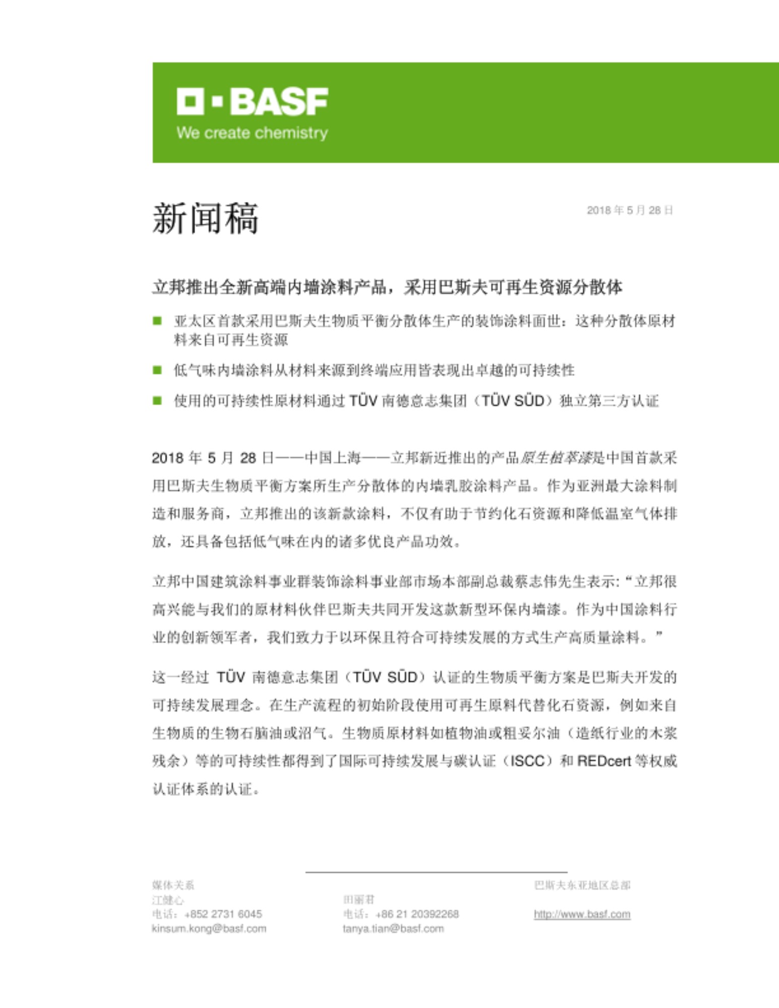 2018年5月28日——中国上海——立邦新近推出的产品原生植萃漆是中国首款采用巴斯夫生物质平衡方案所生产分散体的内墙乳胶涂料产品。作为亚洲最大涂料制造和服务商,立邦推出的该新款涂料,不仅有助于节约化石资源和降低温室气体排放,还具备包括低气味在内的诸多优良产品功效。