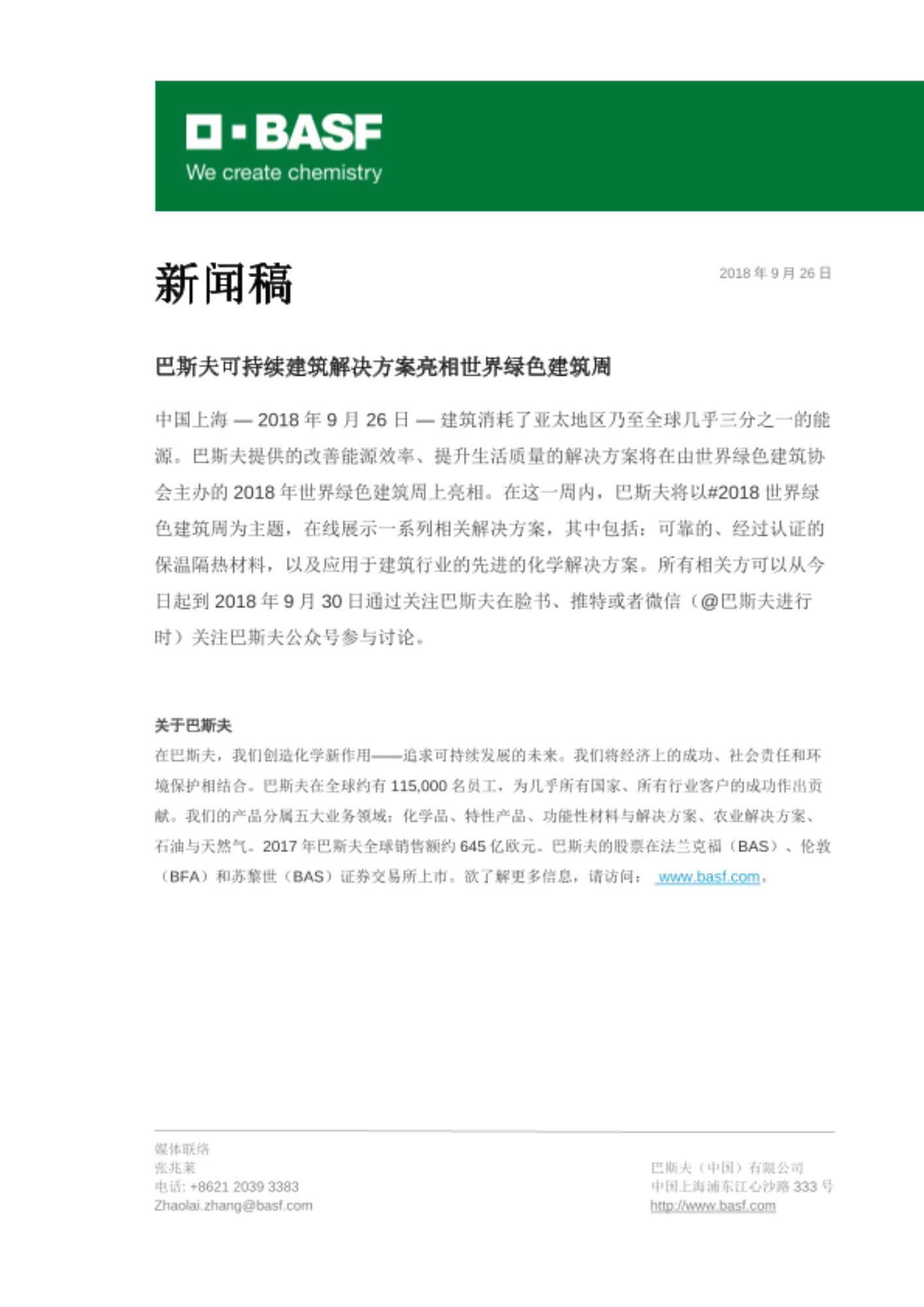 中国上海 — 2018年9 月 26 日 — 建筑消耗了亚太地区乃至全球几乎三分之一的能源。巴斯夫提供的改善能源效率、提升生活质量的解决方案将在由世界绿色建筑协会主办的2018年世界绿色建筑周上亮相。在这一周内,巴斯夫将以#2018世界绿色建筑周为主题,在线展示一系列相关解决方案,其中包括:可靠的、经过认证的保温隔热材料,以及应用于建筑行业的先进的化学解决方案。所有相关方可以从今日起到2018年9月30日通过关注巴斯夫在脸书、推特或者微信(@巴斯夫进行时)关注巴斯夫公众号参与讨论。