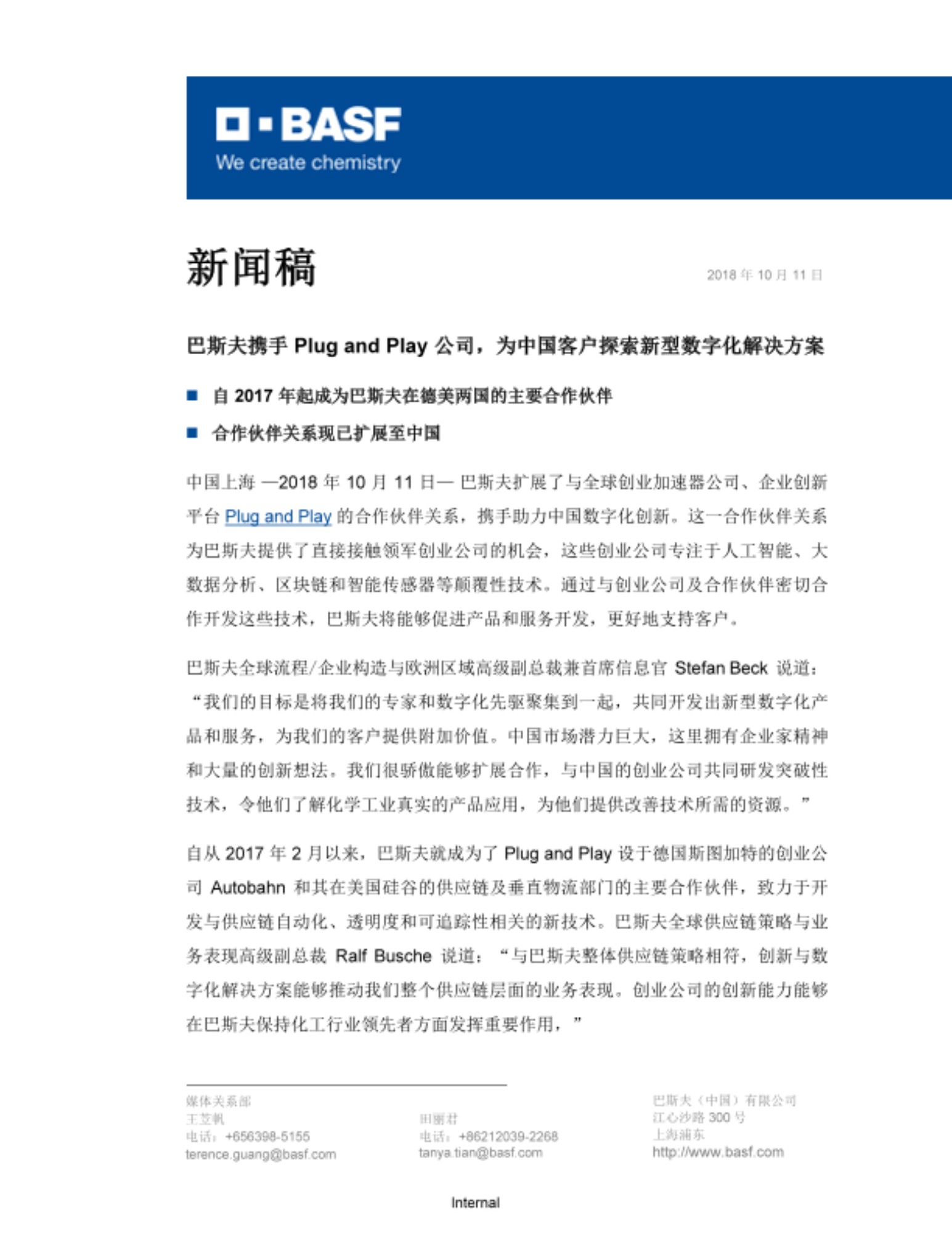 中国上海 —2018 年 10 月 11 日— 巴斯夫扩展了与全球创业加速器公司、企业创新平台 Plug and Play 的合作伙伴关系,携手助力中国数字化创新。这一合作伙伴关系为巴斯夫提供了直接接触领军创业公司的机会,这些创业公司专注于人工智能、大数据分析、区块链和智能传感器等颠覆性技术。通过与创业公司及合作伙伴密切合作开发这些技术,巴斯夫将能够促进产品和服务开发,更好地支持客户。