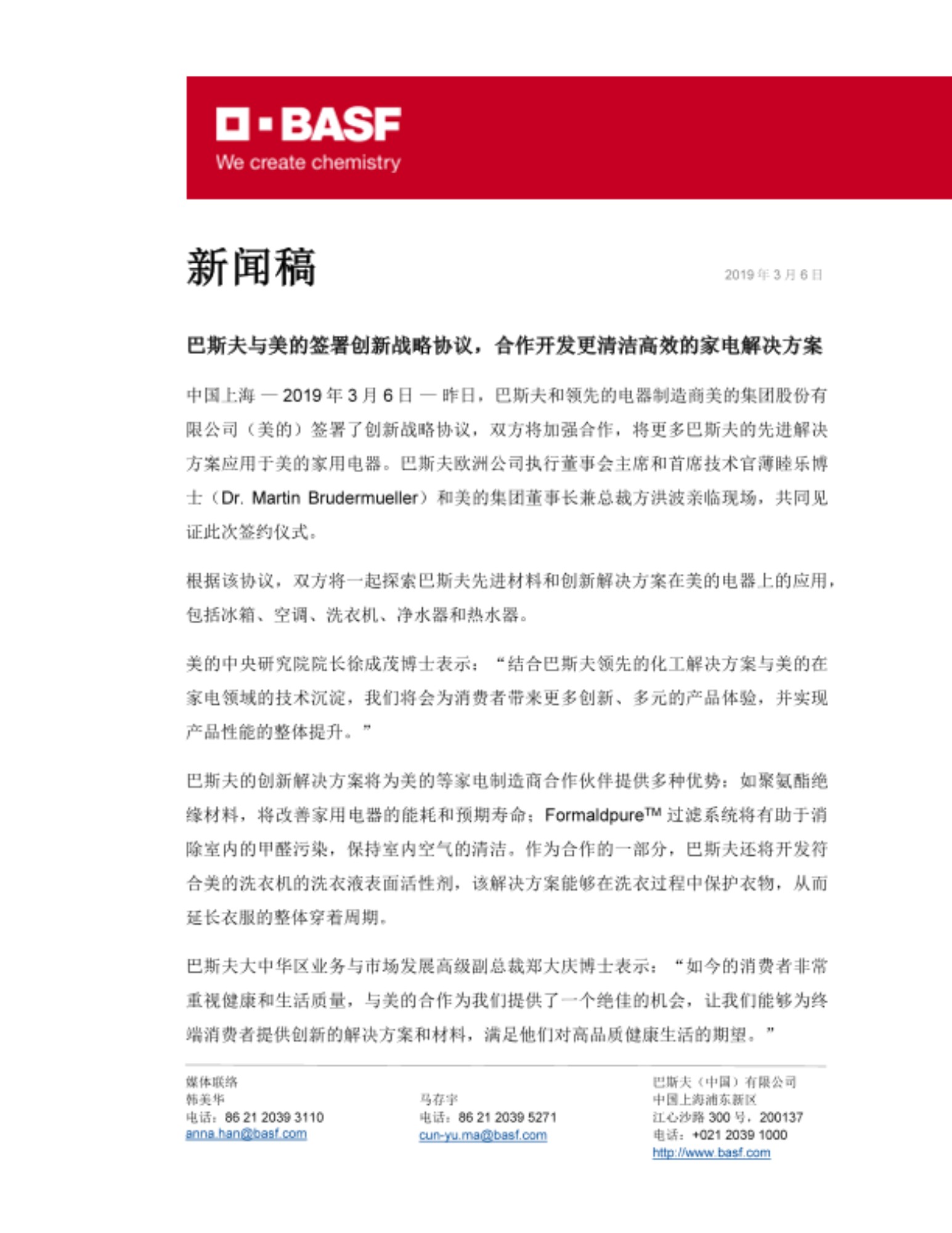 中国上海 — 2019年3月6日 — 昨日,巴斯夫和领先的电器制造商美的集团股份有限公司(美的)签署了创新战略协议,双方将加强合作,将更多巴斯夫的先进解决方案应用于美的家用电器。巴斯夫欧洲公司执行董事会主席和首席技术官薄睦乐博士(Dr. Martin Brudermueller)和美的集团董事长兼总裁方洪波亲临现场,共同见证此次签约仪式。