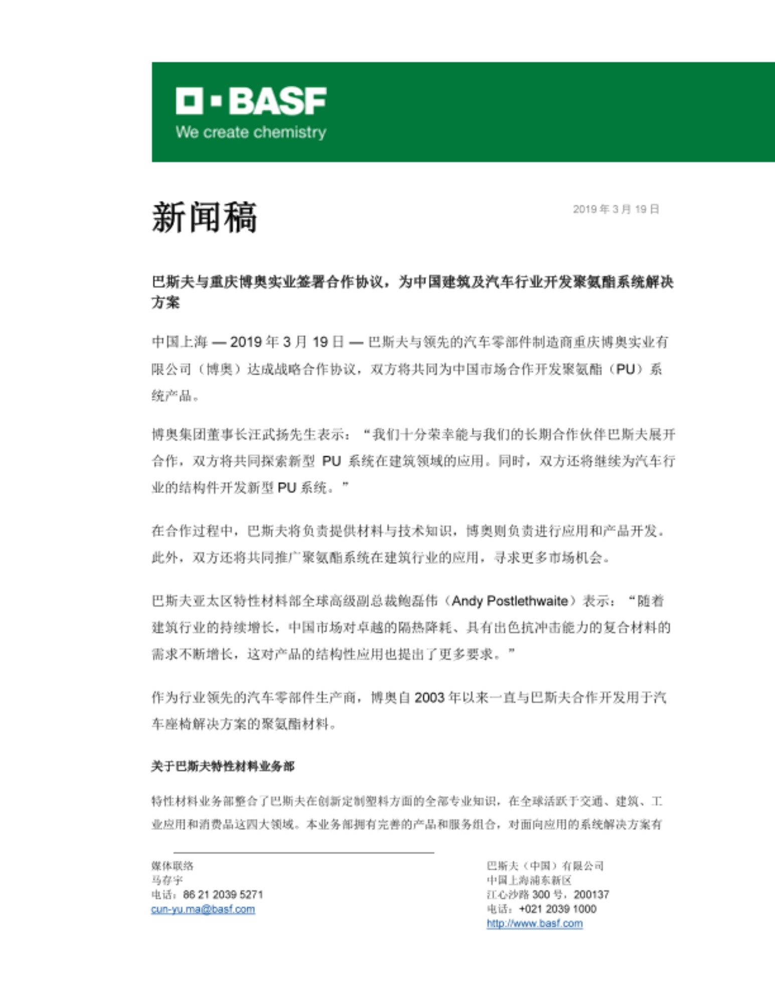 中国上海 — 2019年3月19日 — 巴斯夫与领先的汽车零部件制造商重庆博奥实业有限公司(博奥)达成战略合作协议,双方将共同为中国市场合作开发聚氨酯(PU)系统产品。