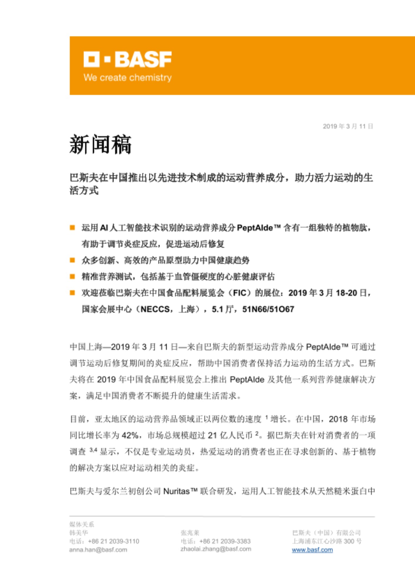 中国上海—2019年3月11日—来自巴斯夫的新型运动营养成分PeptAIde™ 可通过调节运动后修复期间的炎症反应,帮助中国消费者保持活力运动的生活方式。巴斯夫将在2019年中国食品配料展览会上推出PeptAIde及其他一系列营养健康解决方案,满足中国消费者不断提升的健康生活需求。