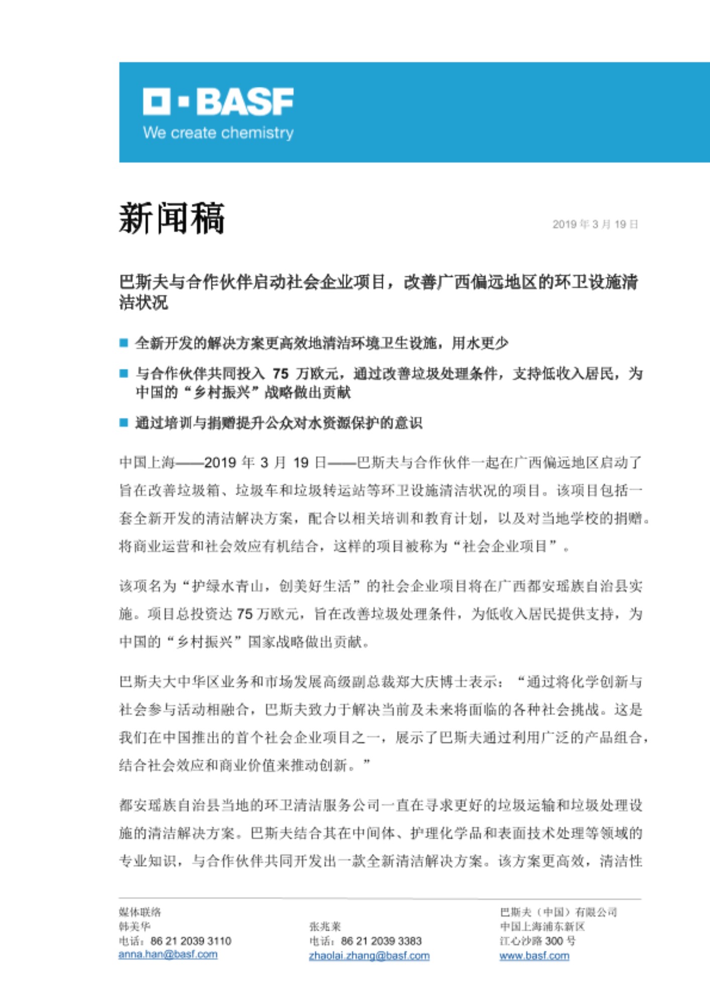 中国上海——2019年3月19日——巴斯夫与合作伙伴一起在广西偏远地区启动了旨在改善垃圾箱、垃圾车和垃圾转运站等环卫设施清洁状况的项目。该项目包括一套全新开发的清洁解决方案,配合以相关培训和教育计划,以及对当地学校的捐赠。将商业运营和社会效应有机结合,这样的项目被称为“社会企业项目”。