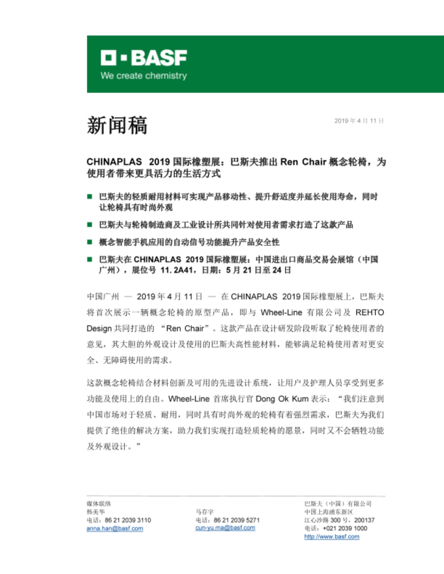 中国广州 — 2019年4月11日 — 在CHINAPLAS 2019国际橡塑展上,巴斯夫将首次展示一辆概念轮椅的原型产品,即与Wheel-Line有限公司及REHTO Design共同打造的 “Ren Chair”。这款产品在设计研发阶段听取了轮椅使用者的意见,其大胆的外观设计及使用的巴斯夫高性能材料,能够满足轮椅使用者对更安全、无障碍使用的需求。