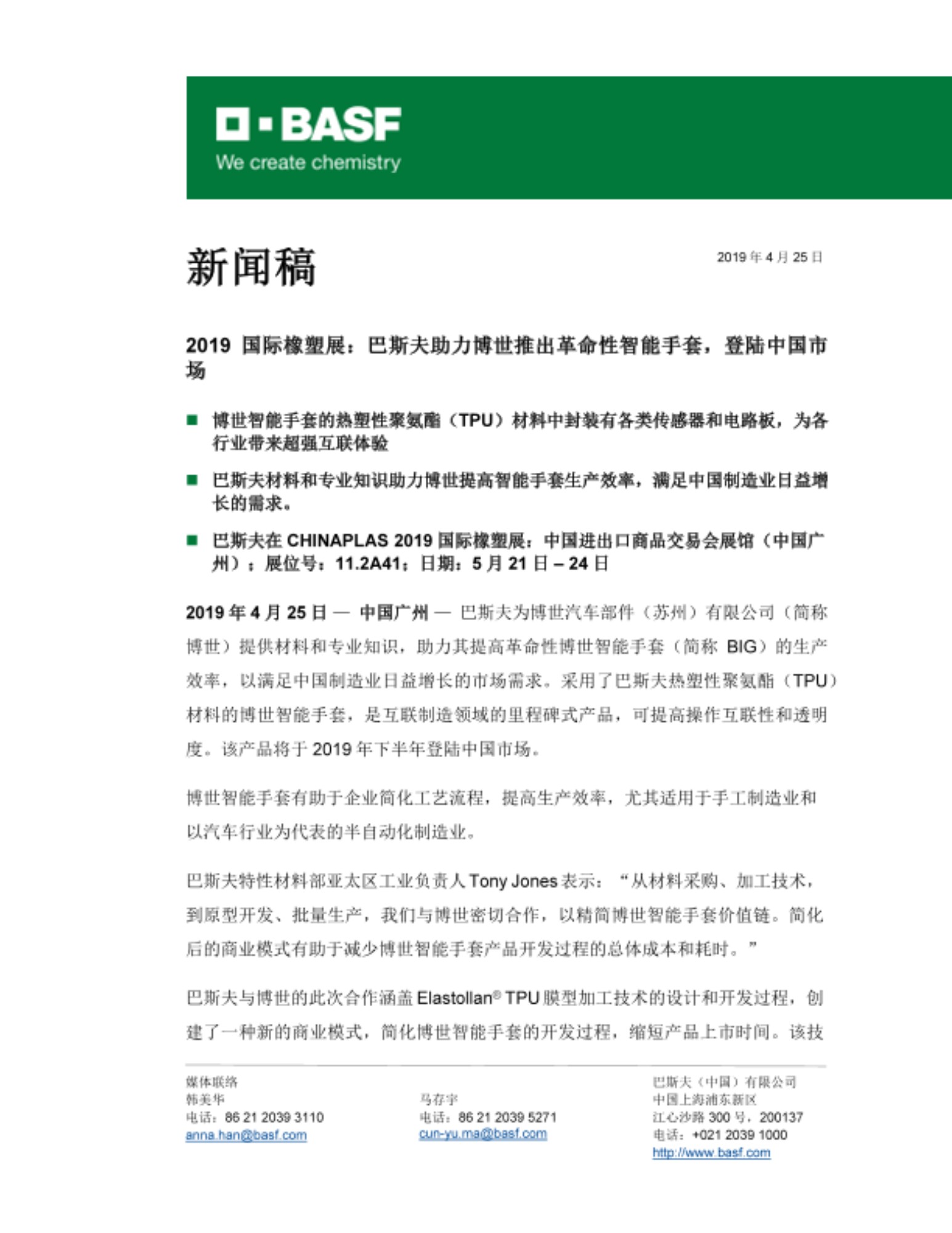 2019国际橡塑展:巴斯夫助力博世推出革命性智能手套,登陆中国市场