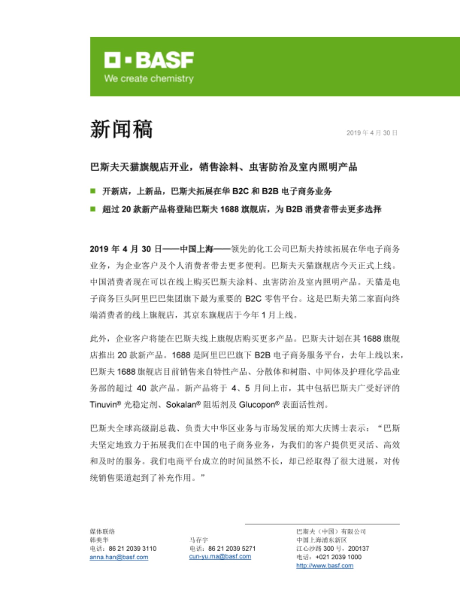 2019年4月30日——中国上海——领先的化工公司巴斯夫持续拓展在华电子商务业务,为企业客户及个人消费者带去更多便利。巴斯夫天猫旗舰店今天正式上线。中国消费者现在可以在线上购买巴斯夫涂料、虫害防治及室内照明产品。天猫是电子商务巨头阿里巴巴集团旗下最为重要的B2C零售平台。这是巴斯夫第二家面向终端消费者的线上旗舰店,其京东旗舰店于今年1月上线。