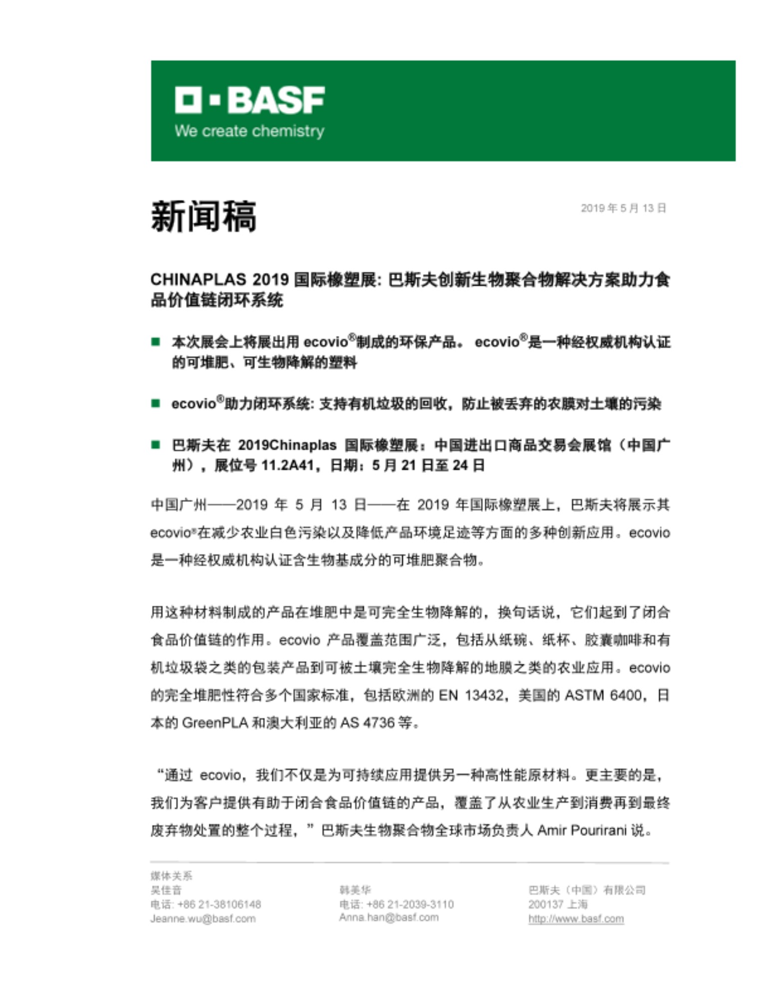 CHINAPLAS 2019国际橡塑展: 巴斯夫创新生物聚合物解决方案助力食品价值链闭环系统
