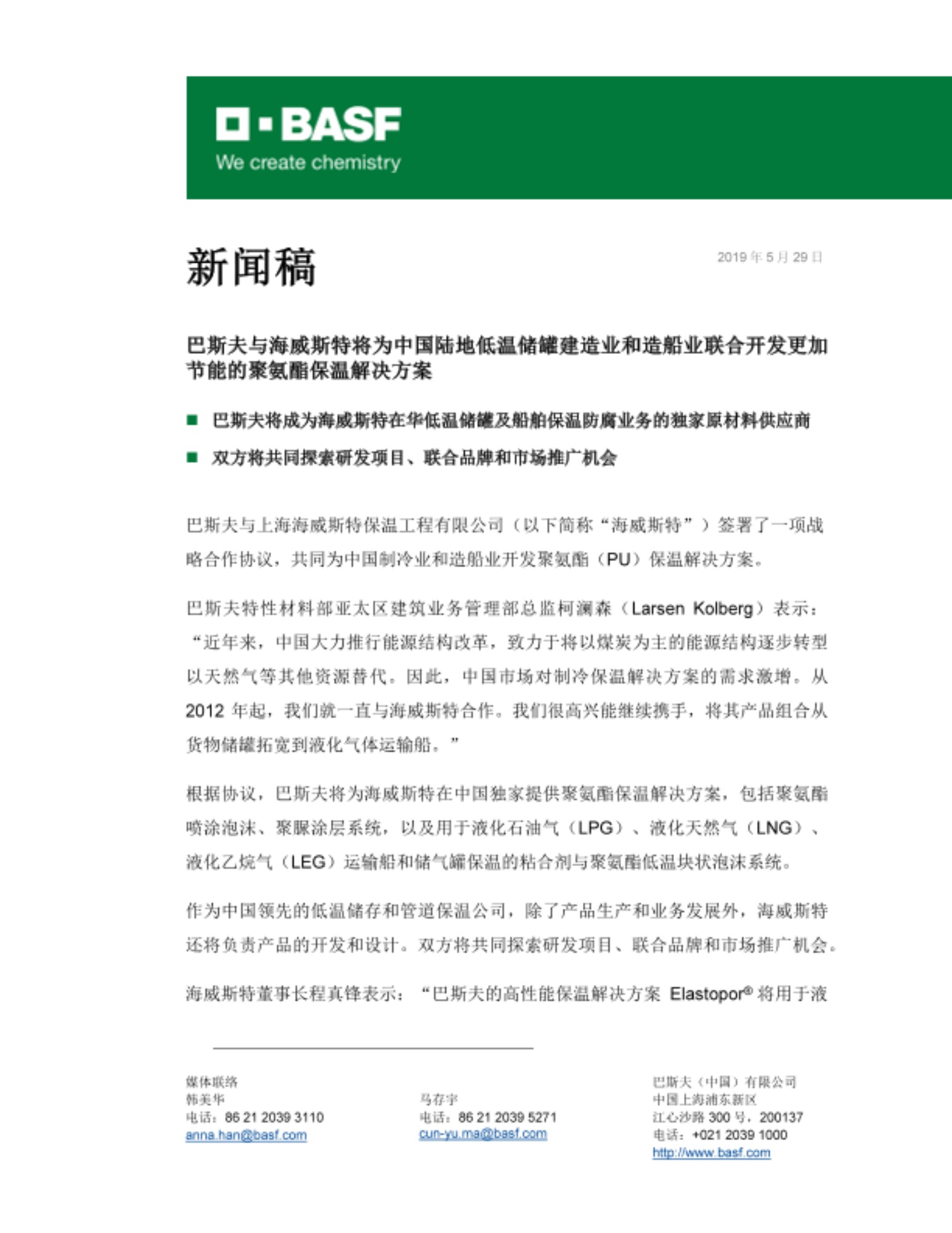 - 巴斯夫将成为海威斯特在华低温储罐及船舶保温防腐业务的独家原材料供应商
