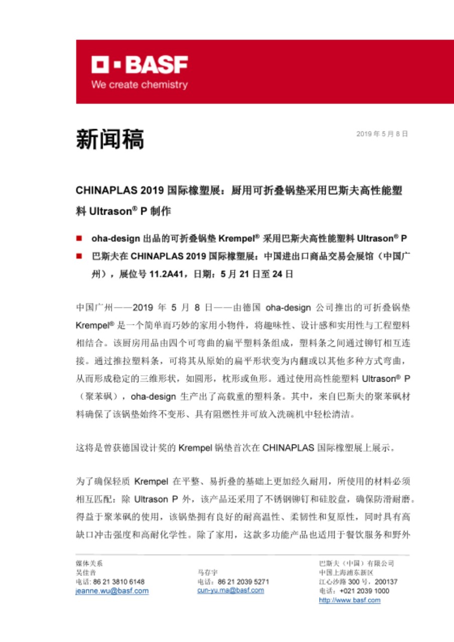 CHINAPLAS 2019国际橡塑展:厨用可折叠锅垫用巴斯夫高性能塑料Ultrason® P制作