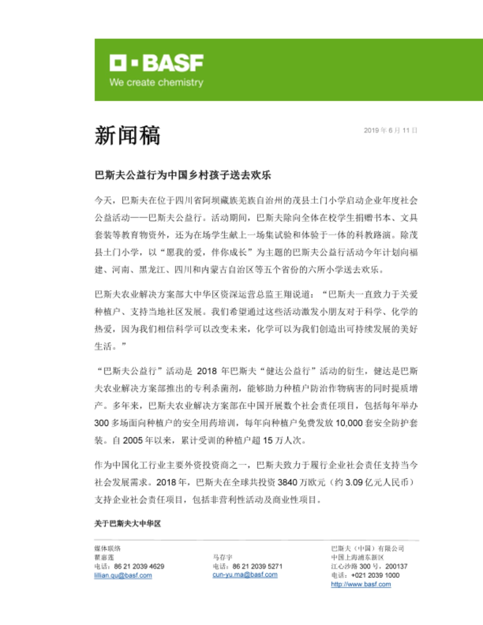 作为中国化工行业主要外资投资商之一,巴斯夫致力于履行企业社会责任支持当今社会发展需求。2018年,巴斯夫在全球共投资3840万欧元(约3.09亿元人民币)支持企业社会责任项目,包括非营利性活动及商业性项目。
