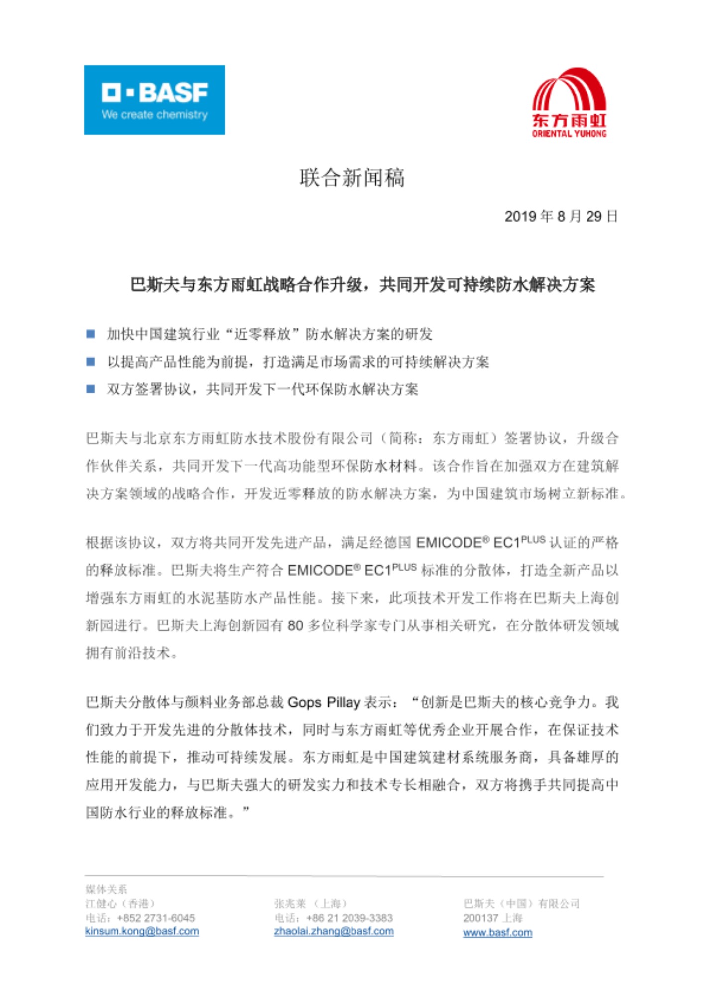 巴斯夫与北京东方雨虹防水技术股份有限公司(简称:东方雨虹)签署协议,升级合作伙伴关系,共同开发下一代高功能型环保防水材料。该合作旨在加强双方在建筑解决方案领域的战略合作,开发近零释放的防水解决方案,为中国建筑市场树立新标准。