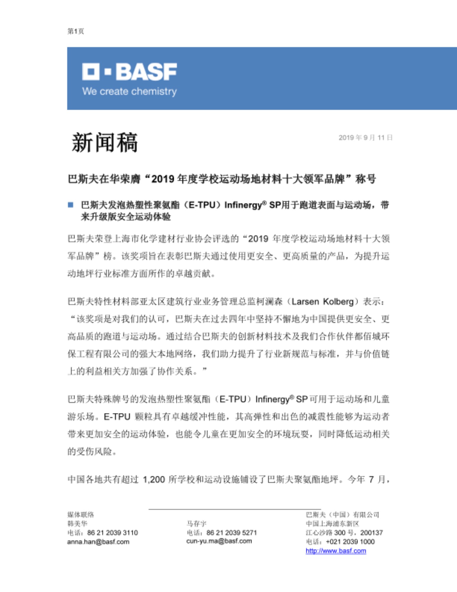 巴斯夫荣登上海市化学建材行业协会评选的“2019年度学校运动场地材料十大领军品牌”榜。该奖项旨在表彰巴斯夫通过使用更安全、更高质量的产品,为提升运动地坪行业标准方面所做的卓越贡献。