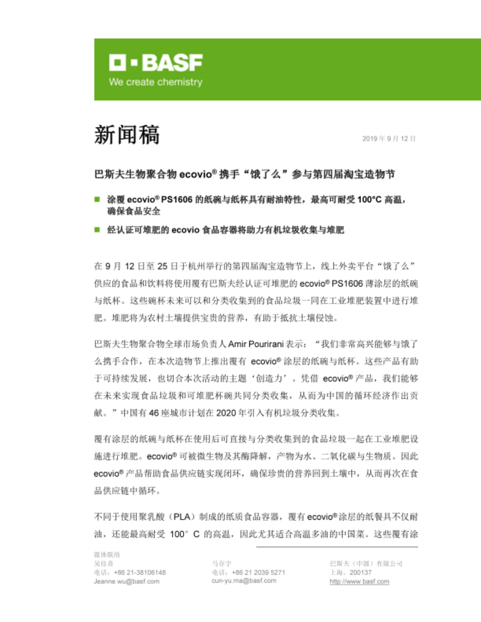 在9月12日至25日于杭州举行的第四届淘宝造物节上,线上外卖平台“饿了么”供应的食品和饮料将使用覆有巴斯夫经认证可堆肥的ecovio® PS1606薄涂层的纸碗与纸杯。这些碗杯未来可以和分类收集到的食品垃圾一同在工业堆肥装置中进行堆肥。堆肥将为农村土壤提供宝贵的营养,有助于抵抗土壤侵蚀。