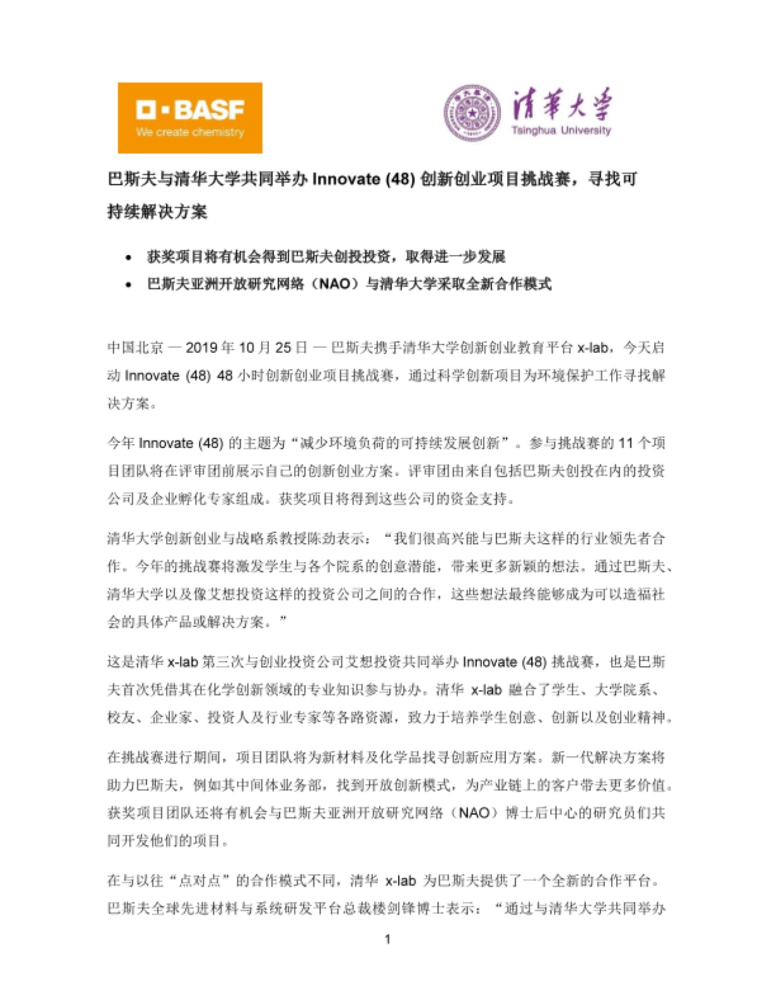 在与以往“点对点”的合作模式不同,清华x-lab为巴斯夫提供了一个全新的合作平台。巴斯夫全球先进材料与系统研发平台总裁楼剑锋博士表示:“通过与清华大学共同举办innovate (48),我们进一步拓展寻找具备潜力提案的方式,这些提案将推动创新、可持续的解决方案。此次合作将在未来进一步丰富巴斯夫的研发渠道。”