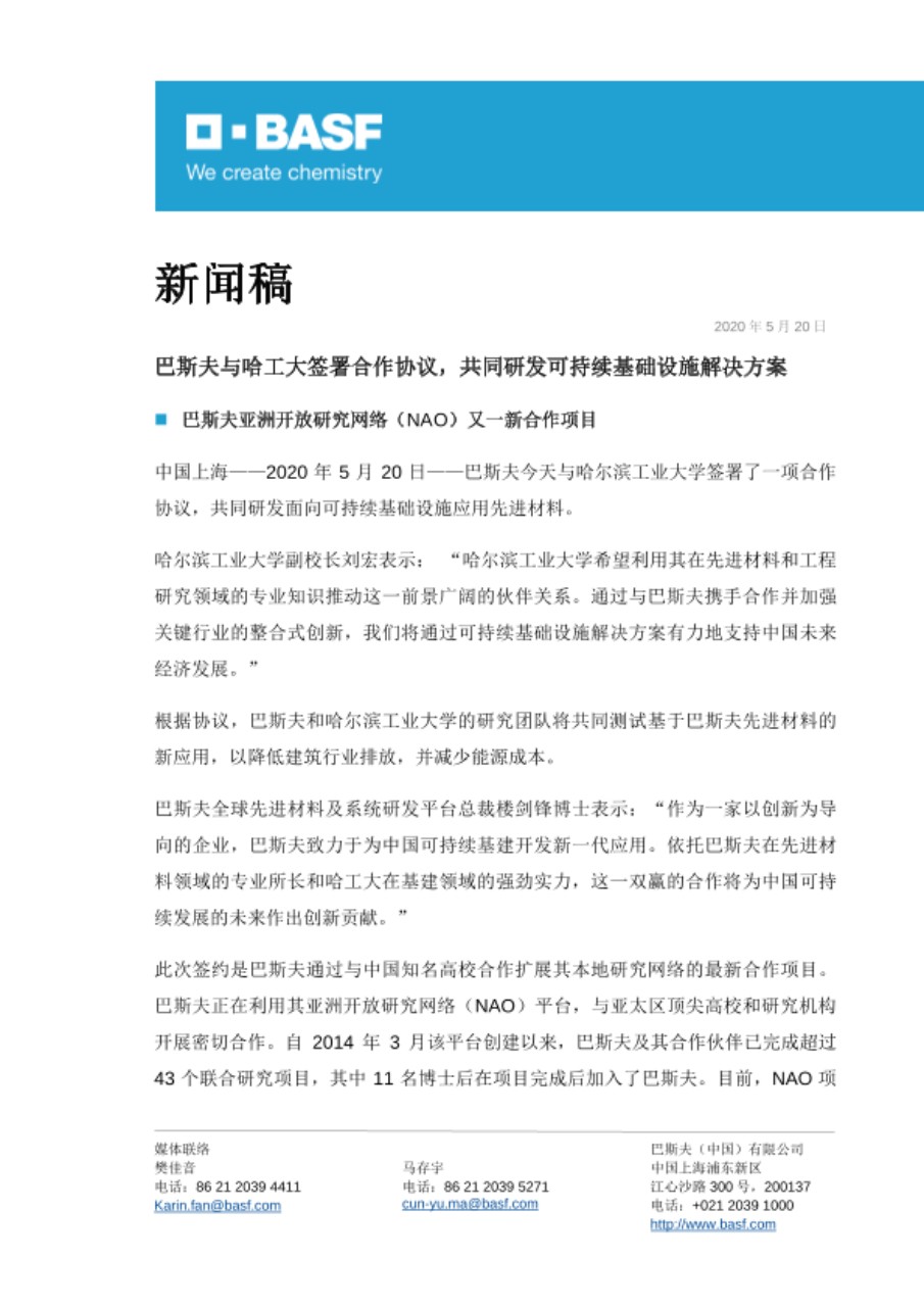 中国上海——2020年5月20日——巴斯夫今天与哈尔滨工业大学签署了一项合作协议,共同研发面向可持续基础设施应用先进材料。
