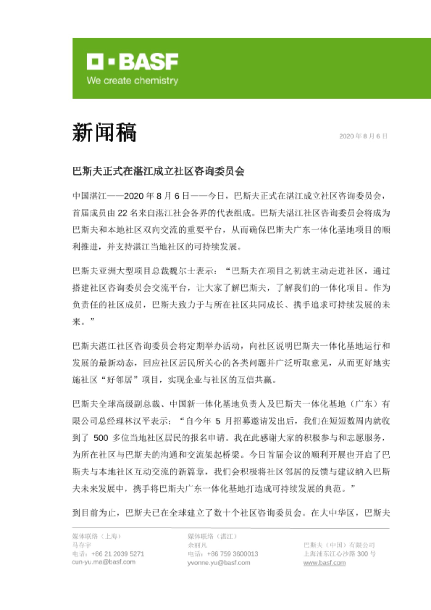 巴斯夫湛江社区咨询委员会将定期举办活动,向社区说明巴斯夫一体化基地运行和发展的最新动态,回应社区居民所关心的各类问题并广泛听取意见,从而更好地实施社区“好邻居”项目,实现企业与社区的互信共赢。