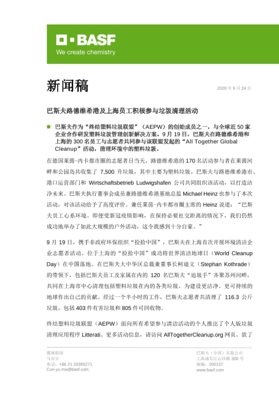 - 巴斯夫作为“终结塑料垃圾联盟”(AEPW)的创始成员之一,与全球近50家企业合作研发塑料垃圾管理创新解决方案。9月19日,巴斯夫在路德维希港和上海的300名员工与志愿者共同参与该联盟发起的“All Together Global Cleanup”活动,清理环境中的塑料垃圾。