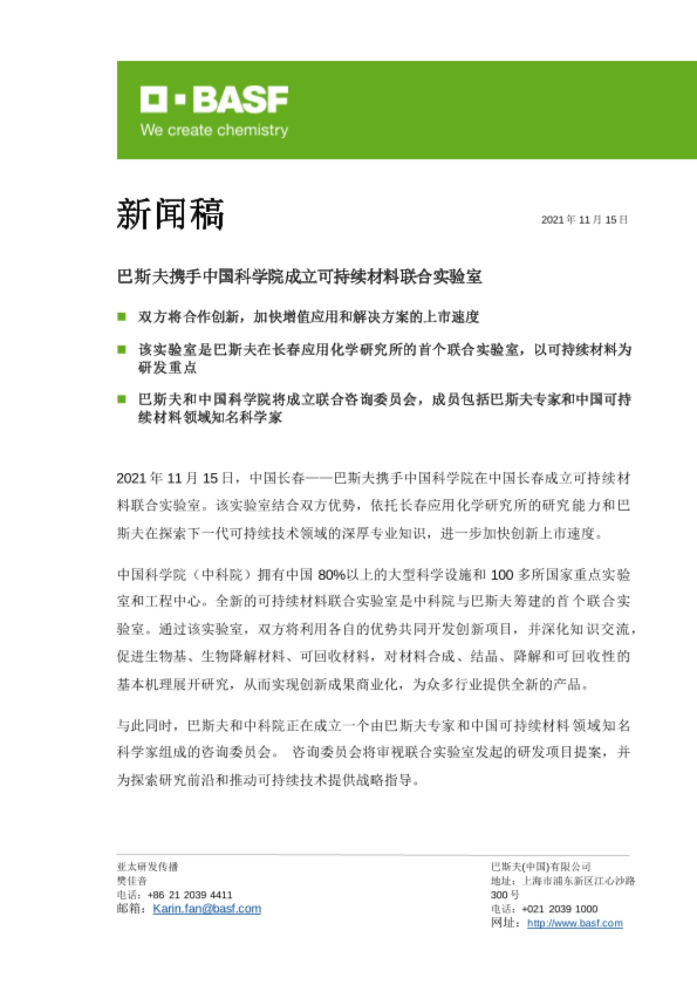 2021年11月15日,中国长春——巴斯夫携手中国科学院在中国长春成立可持续材料联合实验室。该实验室结合双方优势,依托长春应用化学研究所的研究能力和巴斯夫在探索下一代可持续技术领域的深厚专业知识,进一步加快创新上市速度。