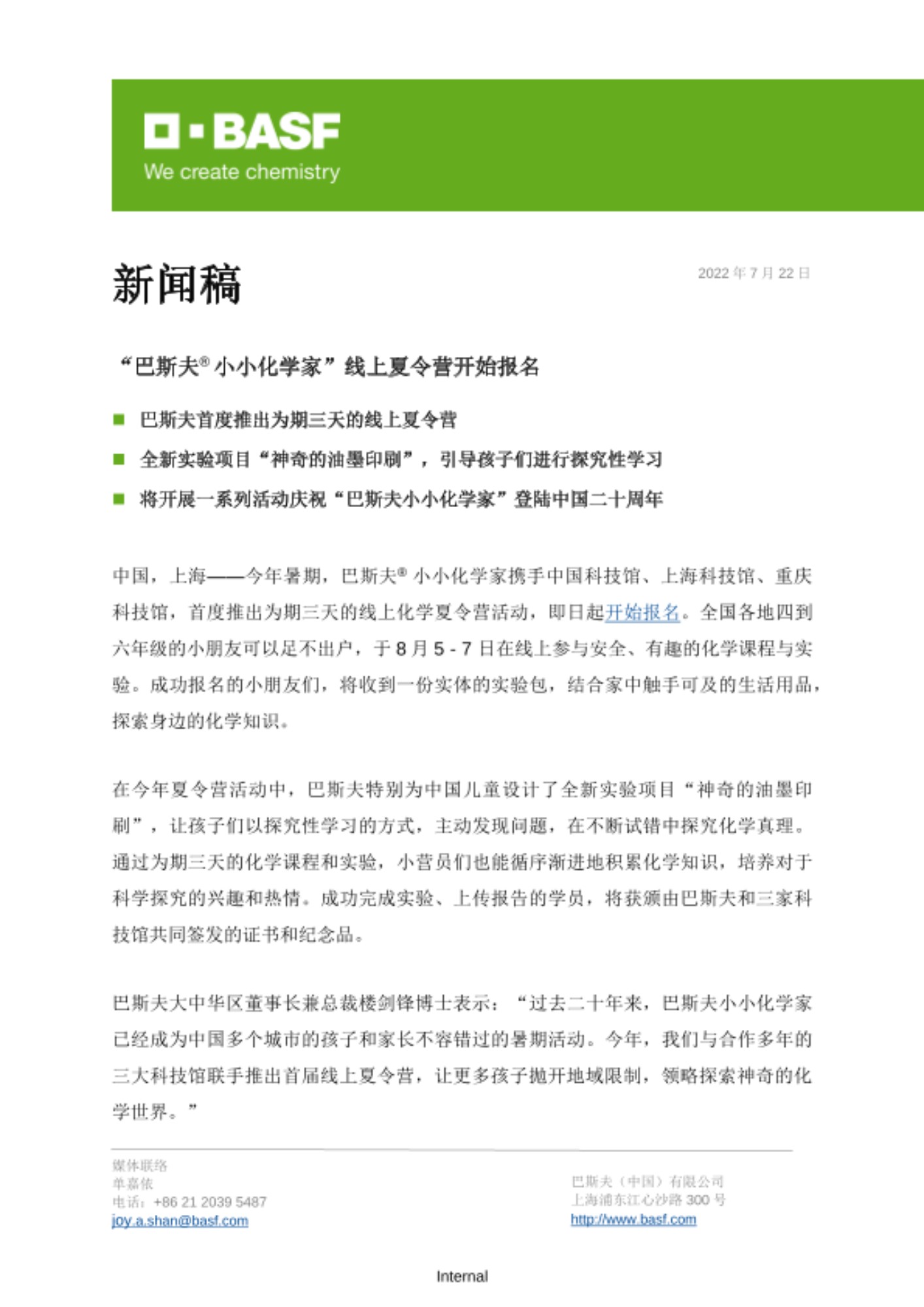 为庆祝巴斯夫小小化学家进入中国二十周年,公司将在下半年开展科普展览、童书发布等一系列庆祝和纪念活动。请点击此处浏览更多巴斯夫小小化学家活动的信息。