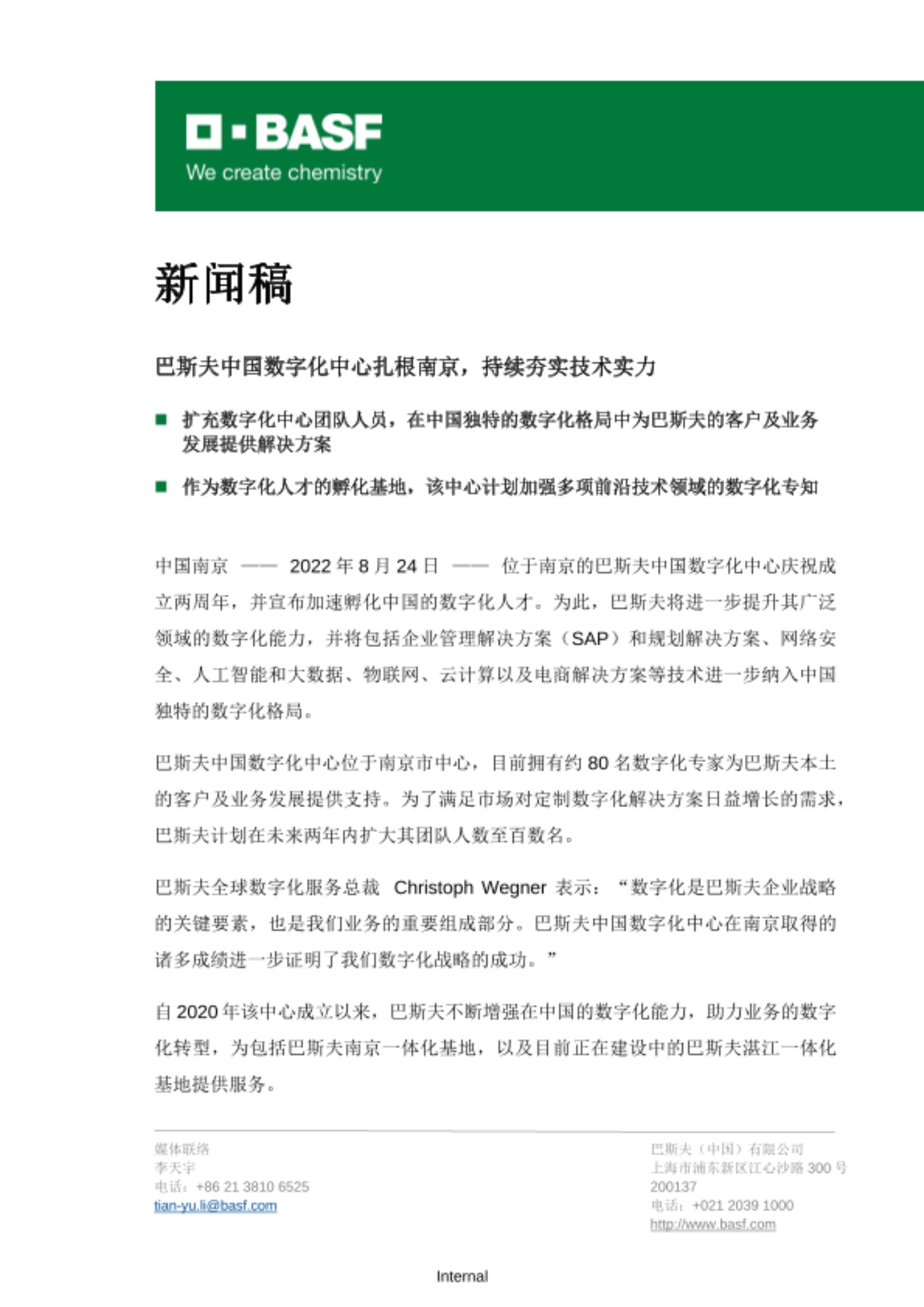 - 扩充数字化中心团队人员,在中国独特的数字化格局中为巴斯夫的客户及业务发展提供解决方案