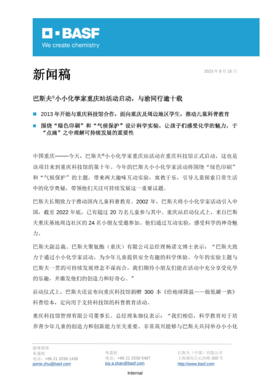 重庆科技馆管理有限公司董事长、总经理朱珈仪表示:“我们相信,科学教育对于培养青少年儿童的创造力和创新能力至关重要。非常高兴能够与巴斯夫共同举办小小化学家系列活动,为孩子们创造了富有探索精神和实验乐趣的科学天地。未来,我们期待同巴斯夫继续合作,开展更多、更新颖的科普教育活动。”
