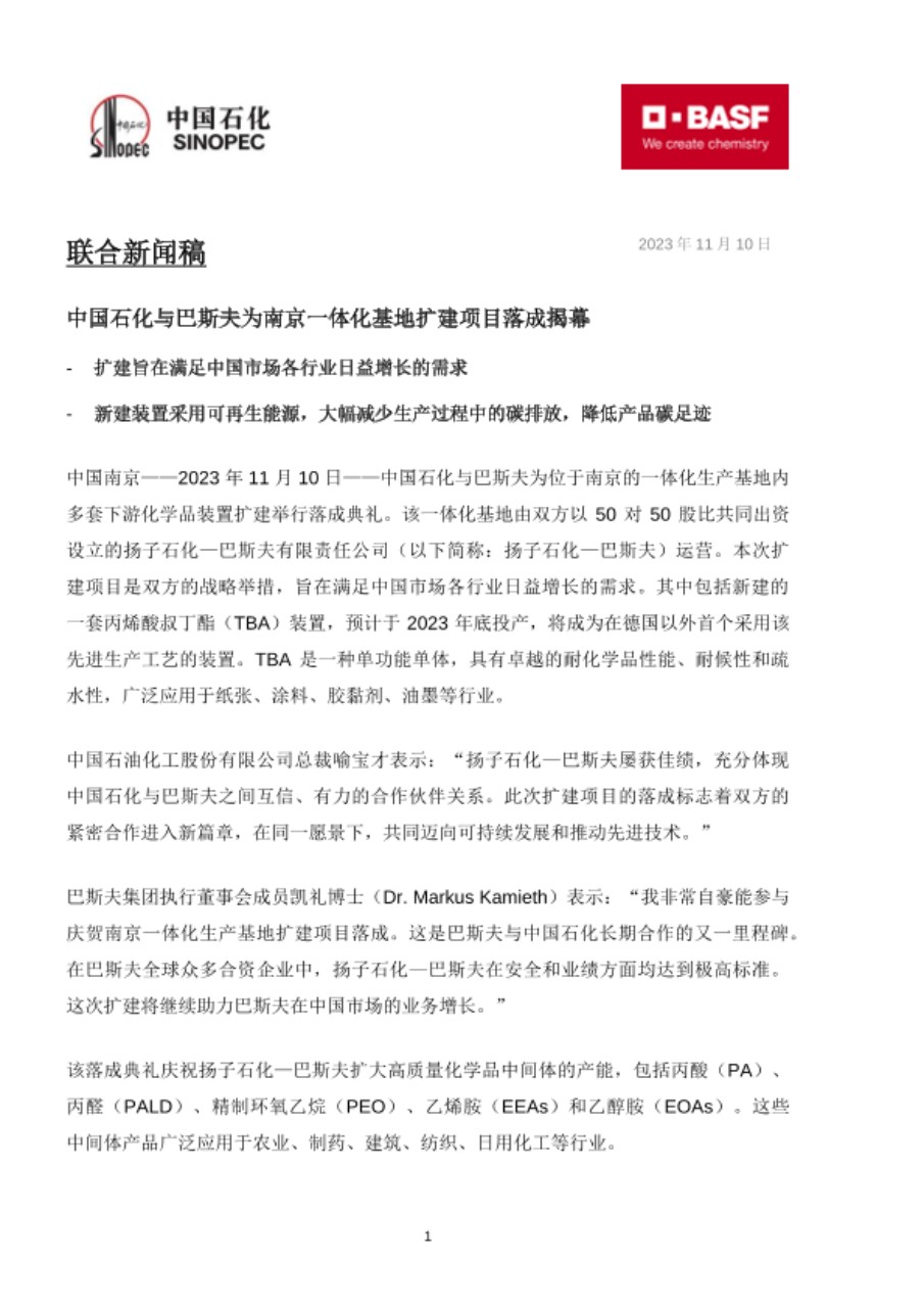 中国南京——2023 年 11 月 10 日——中国石化与巴斯夫为位于南京的一体化生产基地内多套下游化学品装置扩建举行落成典礼。该一体化基地由双方以 50 对 50 股比共同出资设立的扬子石化—巴斯夫有限责任公司(以下简称:扬子石化—巴斯夫)运营。本次扩建项目是双方的战略举措,旨在满足中国市场各行业日益增长的需求。其中包括新建的一套丙烯酸叔丁酯(TBA)装置,预计于 2023 年底投产,将成为在德国以外首个采用该先进生产工艺的装置。TBA 是一种单功能单体,具有卓越的耐化学品性能、耐候性和疏水性,广泛应用于纸张、涂料、胶黏剂、油墨等行业。