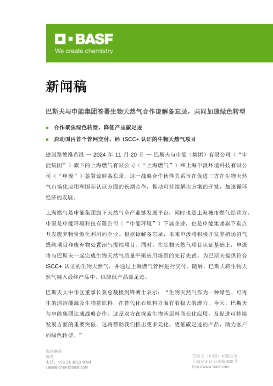 巴斯夫与申能集团签署生物天然气合作谅解备忘录,共同加速绿色转型