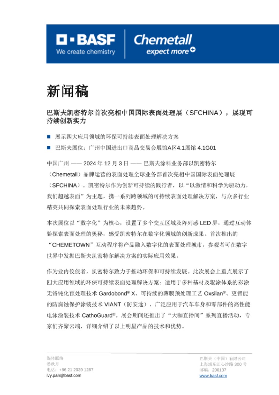 巴斯夫凯密特尔首次亮相中国国际表面处理展(SFCHINA),展现可持续创新实力