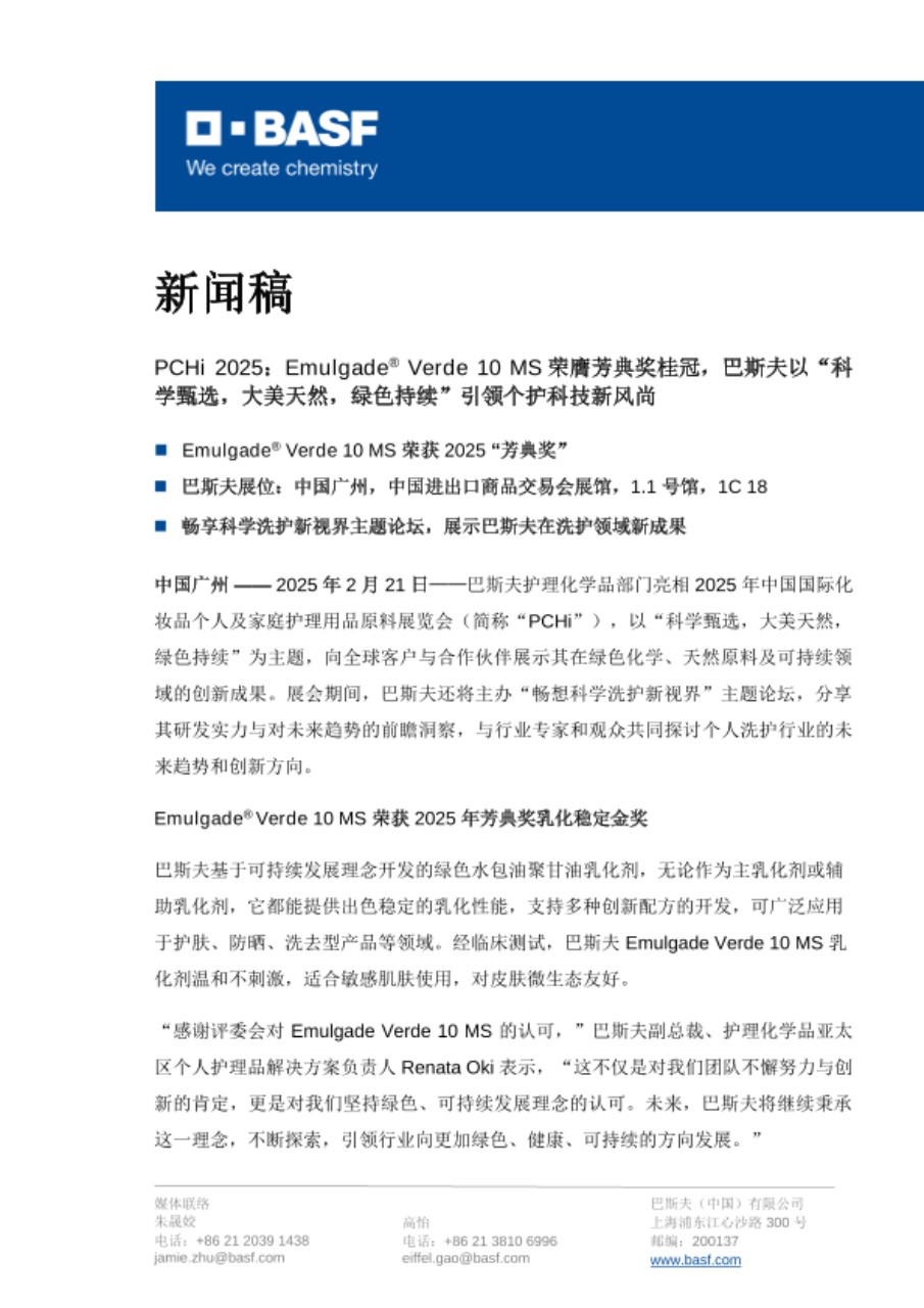 PCHi 2025:Emulgade® Verde 10 MS荣膺芳典奖桂冠,巴斯夫以“科学甄选,大美天然,绿色持续”引领个护科技新风尚