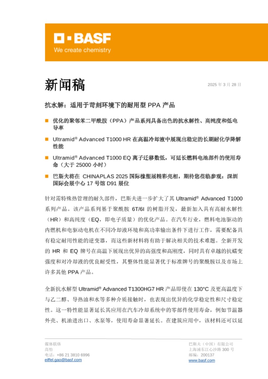 巴斯夫 PPA 全球营销部的 Marc Keller 表示:“自 2018 年我们推出 Ultramid® Advanced T1000 以来,客户一直信赖其出色的性能:无论处于何种温度或气候条件下它都能保持机械强度,并且具有出色的耐湿性和耐化学性。推出新的 HR 和 EQ 牌号之后,我们再次提高标准:我们深知 PPA 在苛刻条件下热管理方面的挑战日益增多;我们能够助力客户应对这些挑战,同时保持其应用的性能和安全。”除了新推出的高性能 HR 和 EQ 牌号以外,需要进行激光焊接的部件还可以使用 Ultramid® Advanced T1000 LT 产品系列,该系列牌号不仅具有耐水解性,还具备激光穿透性。