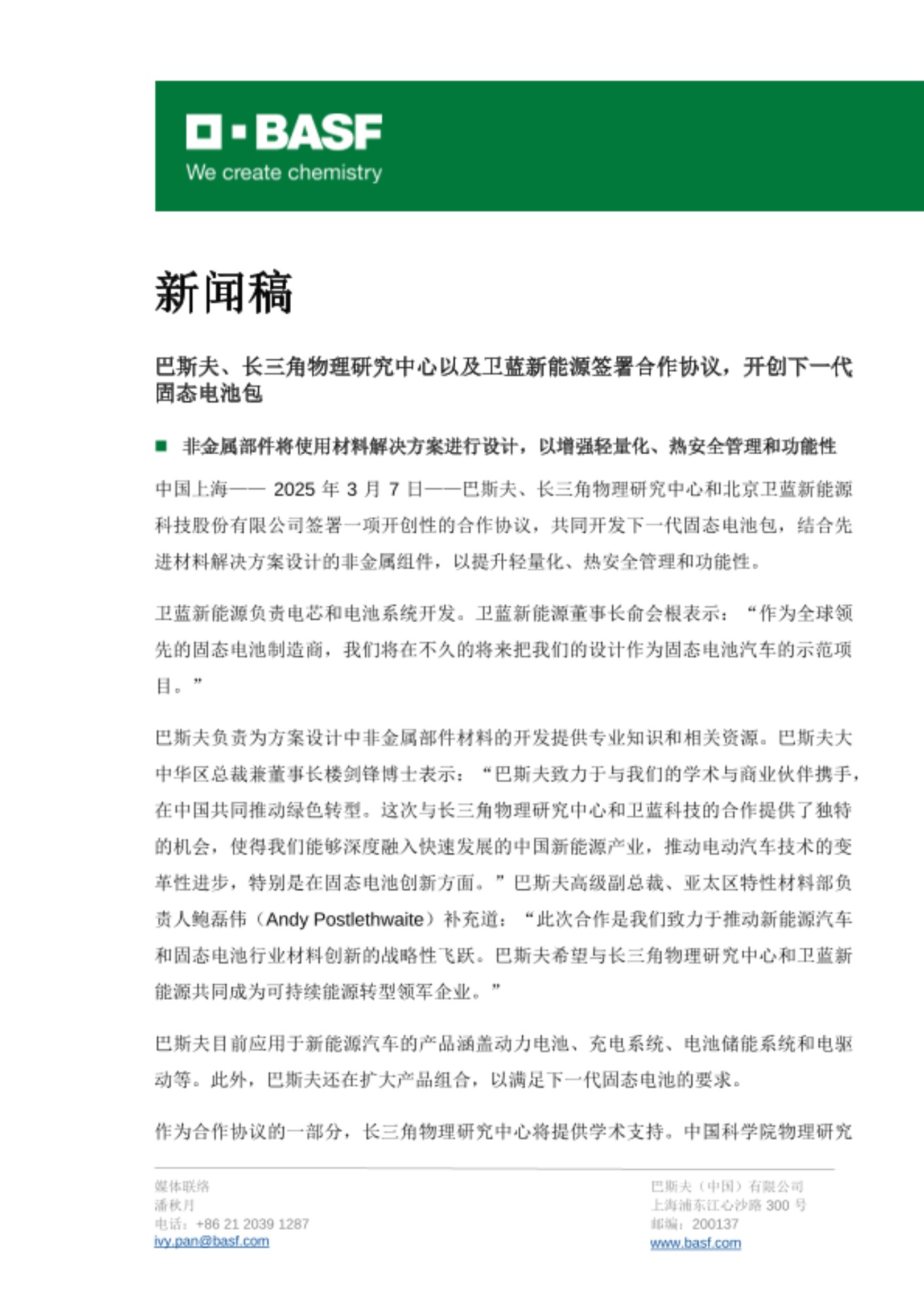 巴斯夫负责为方案设计中非金属部件材料的开发提供专业知识和相关资源。巴斯夫大中华区总裁兼董事长楼剑锋博士表示:“巴斯夫致力于与我们的学术与商业伙伴携手,在中国共同推动绿色转型。这次与长三角物理研究中心和卫蓝科技的合作提供了独特的机会,使得我们能够深度融入快速发展的中国新能源产业,推动电动汽车技术的变革性进步,特别是在固态电池创新方面。”巴斯夫高级副总裁、亚太区特性材料部负责人鲍磊伟(Andy Postlethwaite)补充道:“此次合作是我们致力于推动新能源汽车和固态电池行业材料创新的战略性飞跃。巴斯夫希望与长三角物理研究中心和卫蓝新能源共同成为可持续能源转型领军企业。”