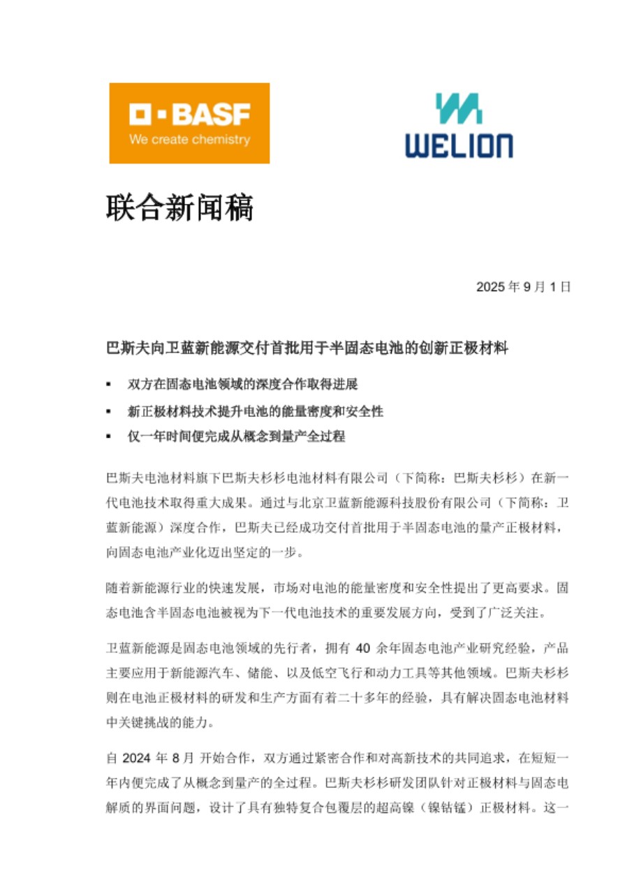 巴斯夫向卫蓝新能源交付首批用于半固态电池的创新正极材料