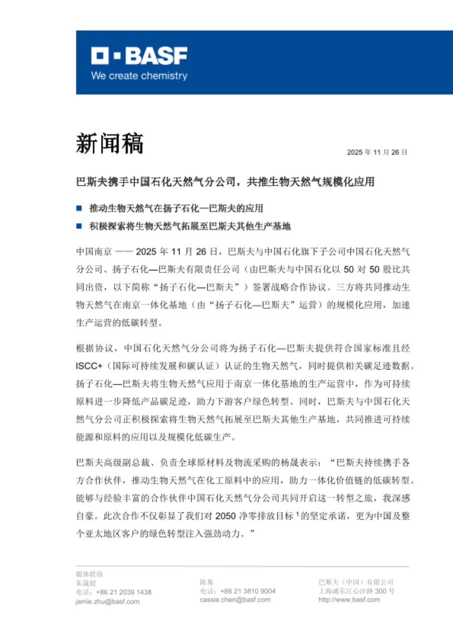 巴斯夫高级副总裁、负责全球原材料及物流采购的杨晟表示:“巴斯夫持续携手各方合作伙伴,推动生物天然气在化工原料中的应用,助力一体化价值链的低碳转型。能够与经验丰富的合作伙伴中国石化天然气分公司共同开启这一转型之旅,我深感自豪。此次合作不仅彰显了我们对 2050 净零排放目标1的坚定承诺,更为中国及整个亚太地区客户的绿色转型注入强劲动力。”