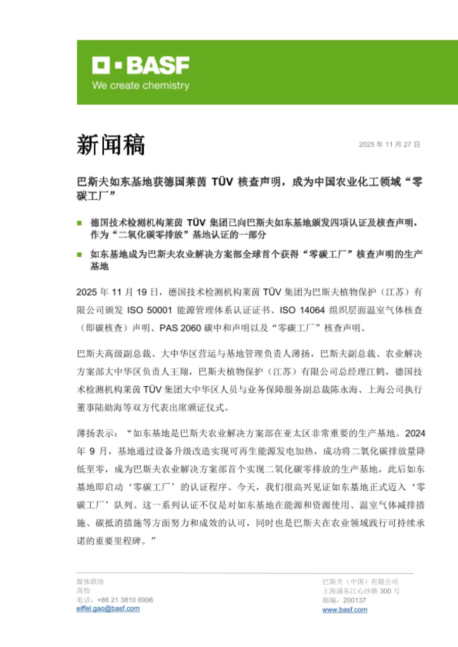 2025 年 11 月 19 日,德国技术检测机构莱茵 TÜV 集团为巴斯夫植物保护(江苏)有限公司颁发 ISO 50001 能源管理体系认证证书、ISO 14064 组织层面温室气体核查(即碳核查)声明、PAS 2060 碳中和声明以及“零碳工厂”核查声明。