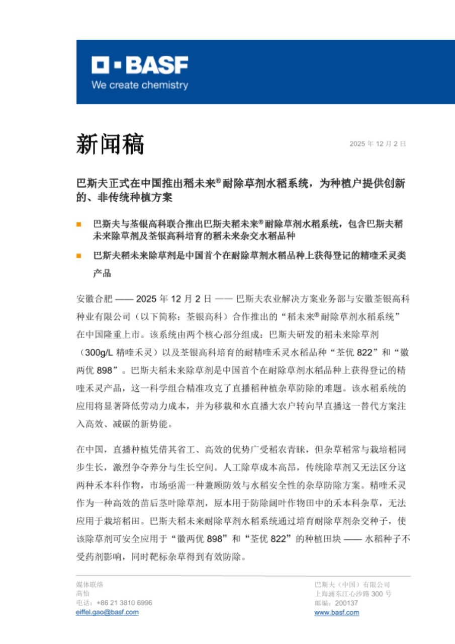 安徽合肥 —— 2025 年 12 月 2 日 —— 巴斯夫农业解决方案业务部与安徽荃银高科种业有限公司(以下简称:荃银高科)合作推出的“稻未来® 耐除草剂水稻系统”在中国隆重上市。该系统由两个核心部分组成:巴斯夫研发的稻未来除草剂(300g/L 精喹禾灵)以及荃银高科培育的耐精喹禾灵水稻品种 “荃优 822” 和 “徽两优 898”。巴斯夫稻未来除草剂是中国首个在耐除草剂水稻品种上获得登记的精喹禾灵产品,这一科学组合精准攻克了直播稻种植杂草防除的难题。该水稻系统的应用将显著降低劳动力成本,并为移栽和水直播大农户转向旱直播这一替代方案注入高效、减碳的新势能。