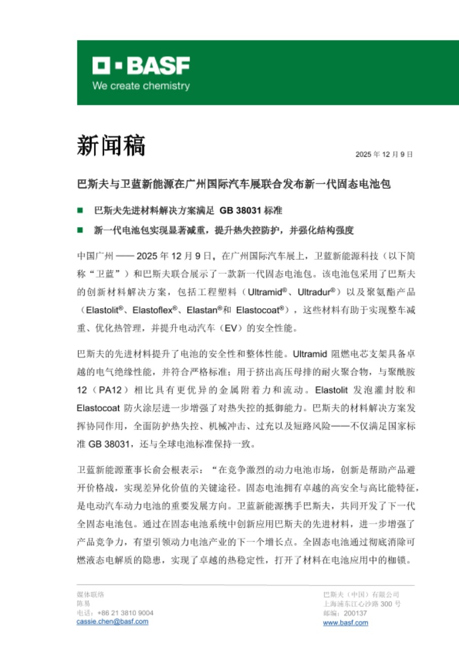 中国广州 —— 2025 年 12 月 9 日,在广州国际汽车展上,卫蓝新能源科技(以下简称“卫蓝”)和巴斯夫联合展示了一款新一代固态电池包。该电池包采用了巴斯夫的创新材料解决方案,包括工程塑料(Ultramid®、Ultradur®)以及聚氨酯产品(Elastolit®、Elastoflex®、Elastan® 和 Elastocoat®),这些材料有助于实现整车减重、优化热管理,并提升电动汽车(EV)的安全性能。