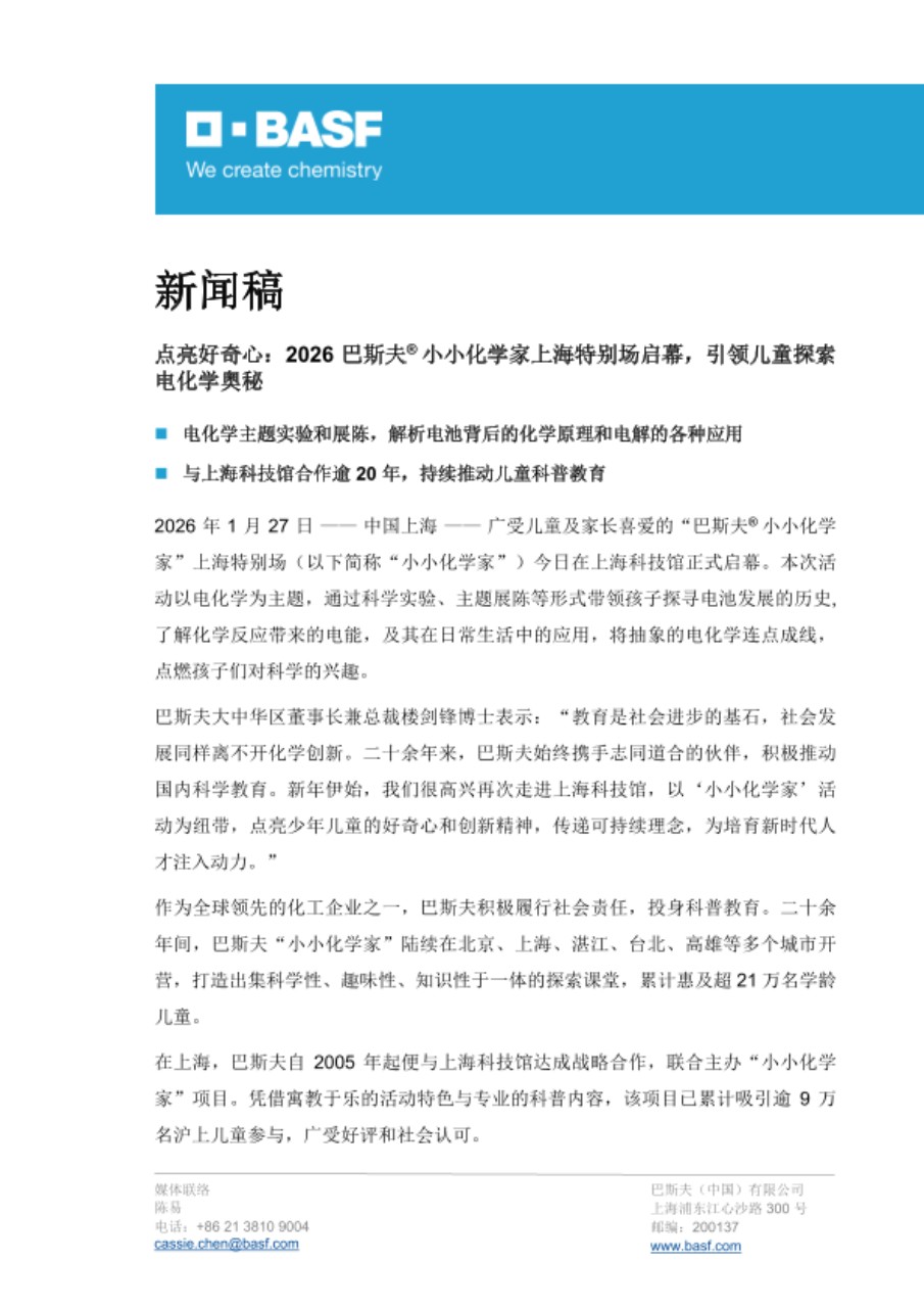 2026 年 1 月 27 日 —— 中国上海 —— 广受儿童及家长喜爱的“巴斯夫® 小小化学家”上海特别场(以下简称“小小化学家”)今日在上海科技馆正式启幕。本次活动以电化学为主题,通过科学实验、主题展陈等形式带领孩子探寻电池发展的历史,了解化学反应带来的电能,及其在日常生活中的应用,将抽象的电化学连点成线,点燃孩子们对科学的兴趣。