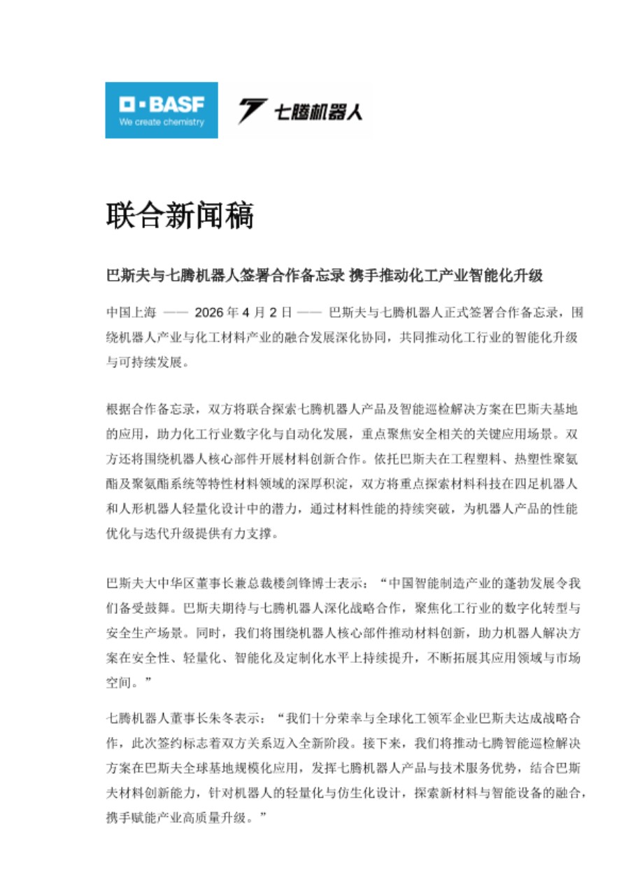 中国上海 —— 2026 年 4 月 2 日 —— 巴斯夫与七腾机器人正式签署合作备忘录,围绕机器人产业与化工材料产业的融合发展深化协同,共同推动化工行业的智能化升级与可持续发展。