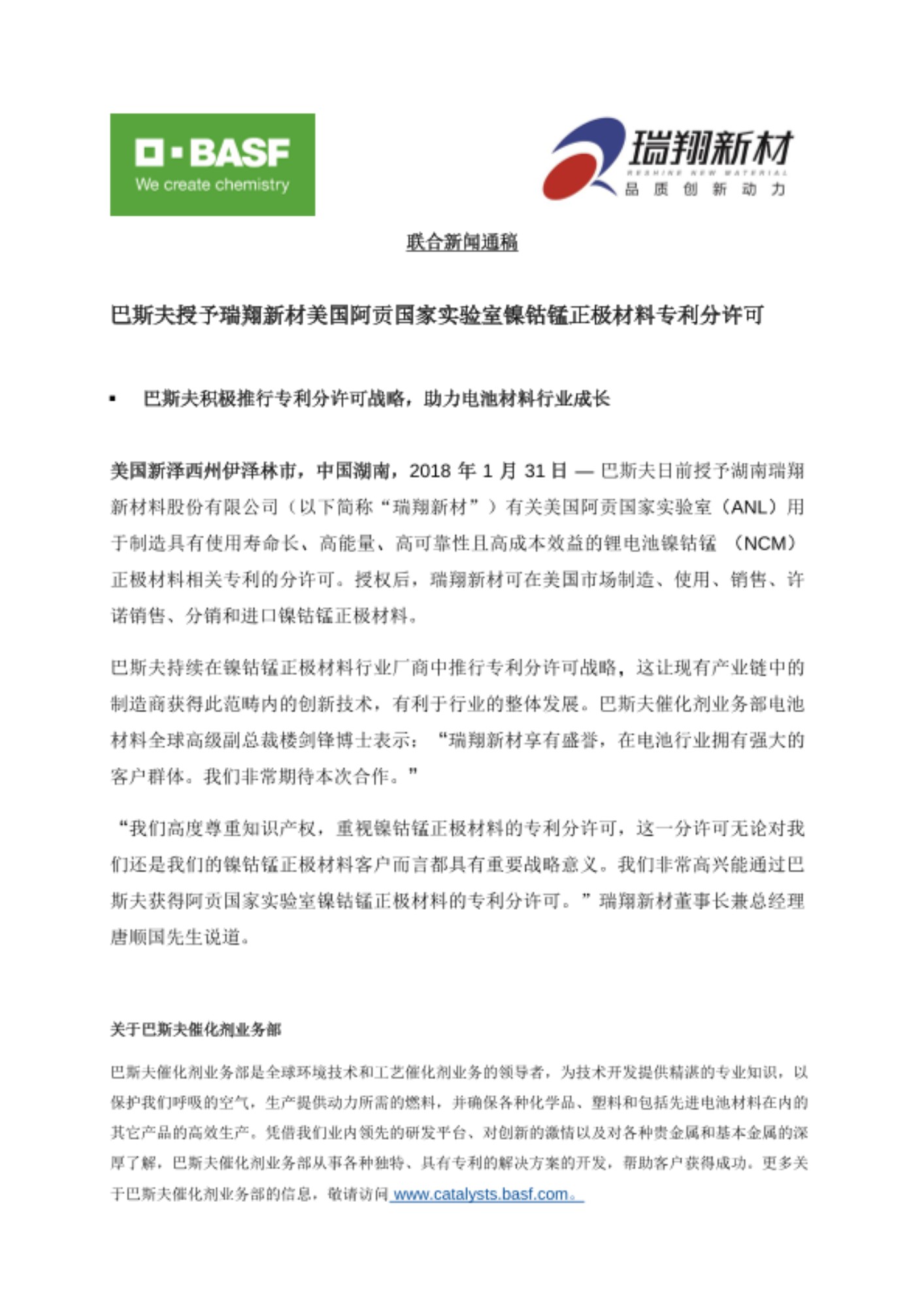 美国新泽西州伊泽林市,中国湖南,2018 年 1 月 31日 — 巴斯夫日前授予湖南瑞翔新材料股份有限公司(以下简称“瑞翔新材”)有关美国阿贡国家实验室(ANL)用于制造具有使用寿命长、高能量、高可靠性且高成本效益的锂电池镍钴锰 (NCM)正极材料相关专利的分许可。授权后,瑞翔新材可在美国市场制造、使用、销售、许诺销售、分销和进口镍钴锰正极材料。