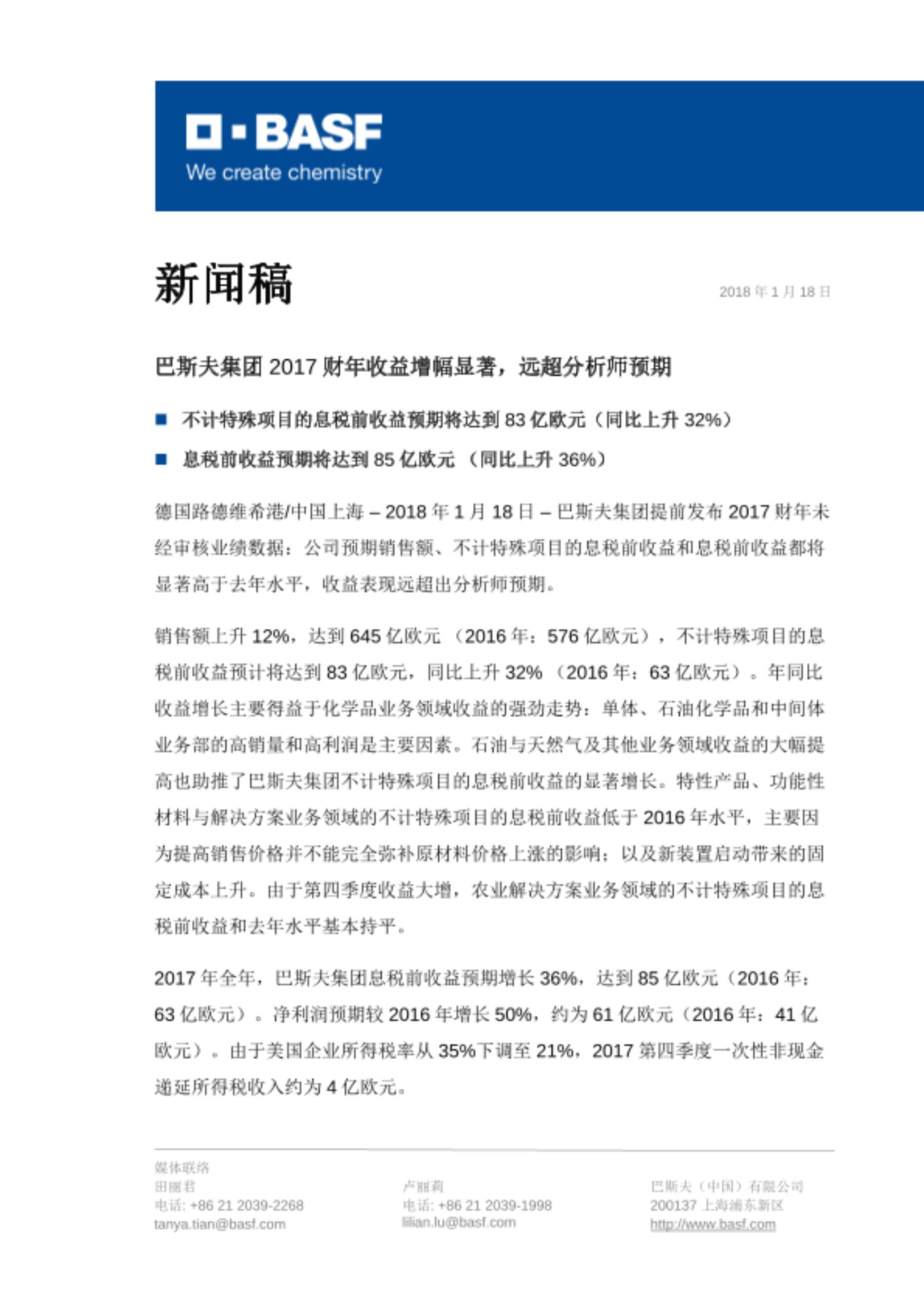 德国路德维希港/中国上海 – 2018年1月19日 – 巴斯夫集团提前发布2017财年未经审核业绩数据:公司预期销售额、不计特殊项目的息税前收益和息税前收益都将显著高于去年水平,收益表现远超出分析师预期。