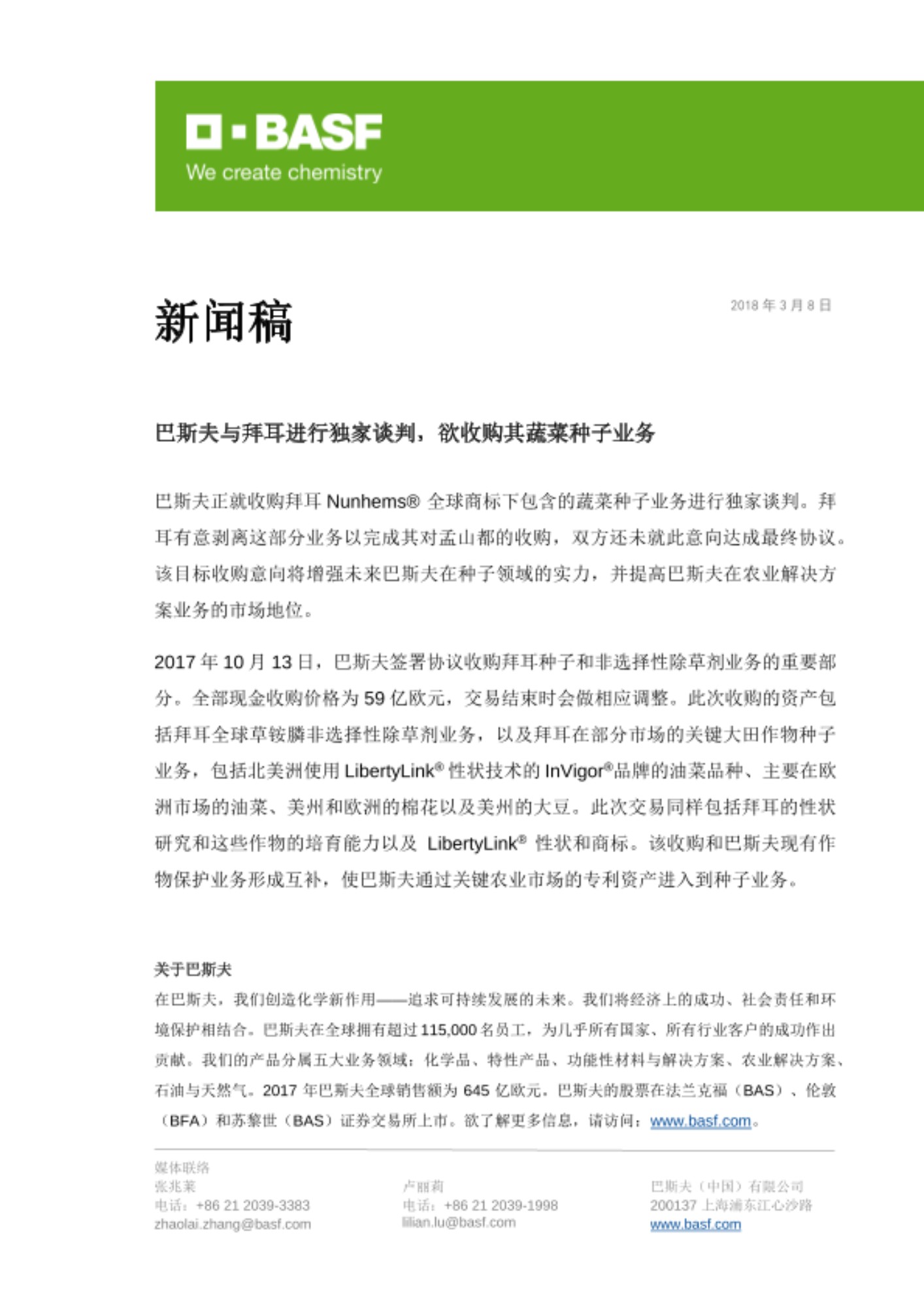 2017年10月13日,巴斯夫签署协议收购拜耳种子和非选择性除草剂业务的重要部分。全部现金收购价格为59亿欧元,交易结束时会做相应调整。此次收购的资产包括拜耳全球草铵膦非选择性除草剂业务,以及拜耳在部分市场的关键大田作物种子业务,包括北美洲使用LibertyLink®性状技术的InVigor®品牌的油菜品种、主要在欧洲市场的油菜、美州和欧洲的棉花以及美州的大豆。此次交易同样包括拜耳的性状研究和这些作物的培育能力以及LibertyLink®性状和商标。该收购和巴斯夫现有作物保护业务形成互补,使巴斯夫通过关键农业市场的专利资产进入到种子业务。