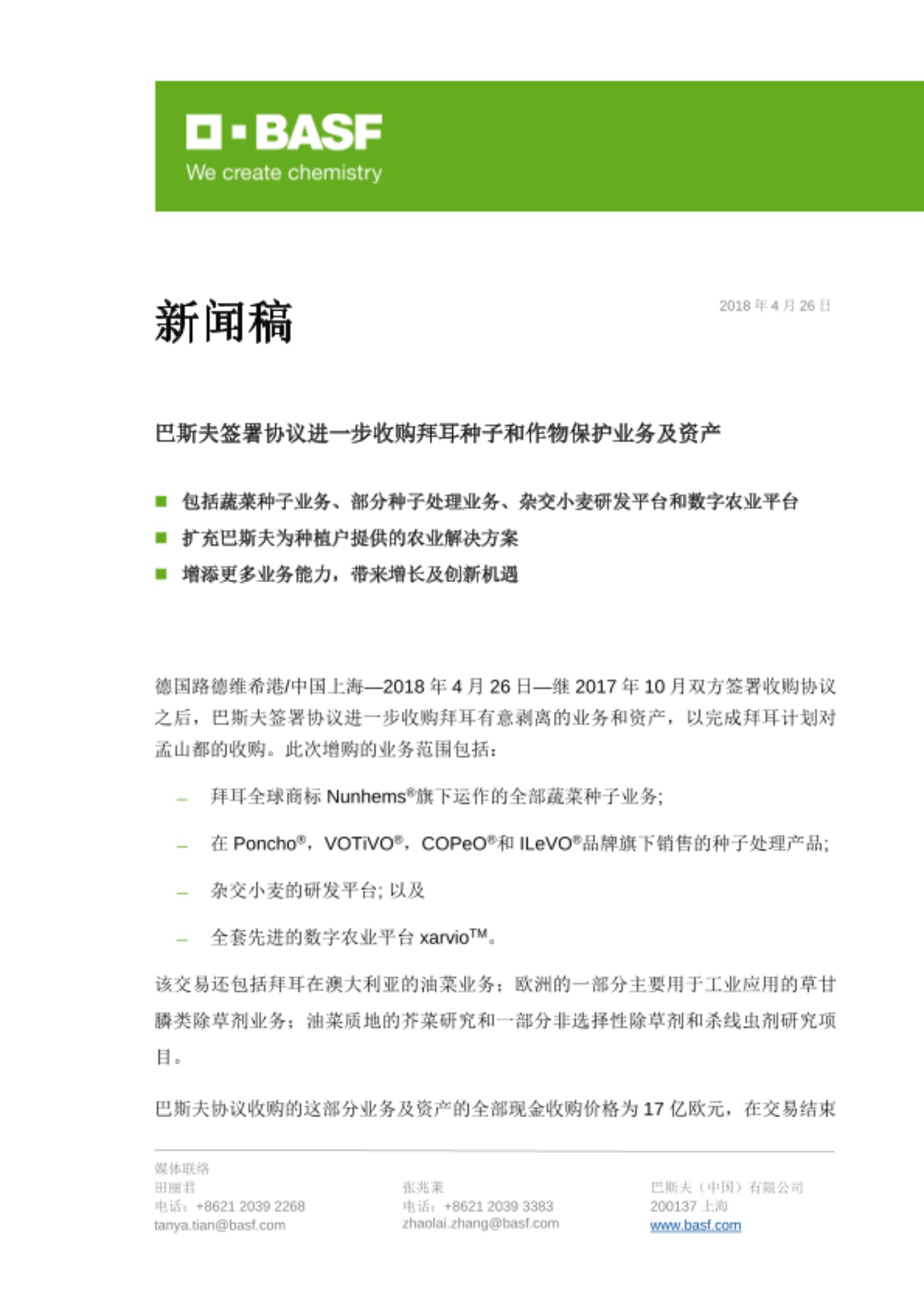 德国路德维希港/中国上海—2018年4月26日—继2017年10月双方签署收购协议之后,巴斯夫签署协议进一步收购拜耳有意剥离的业务和资产,以完成拜耳计划对孟山都的收购。此次增购的业务范围包括:
